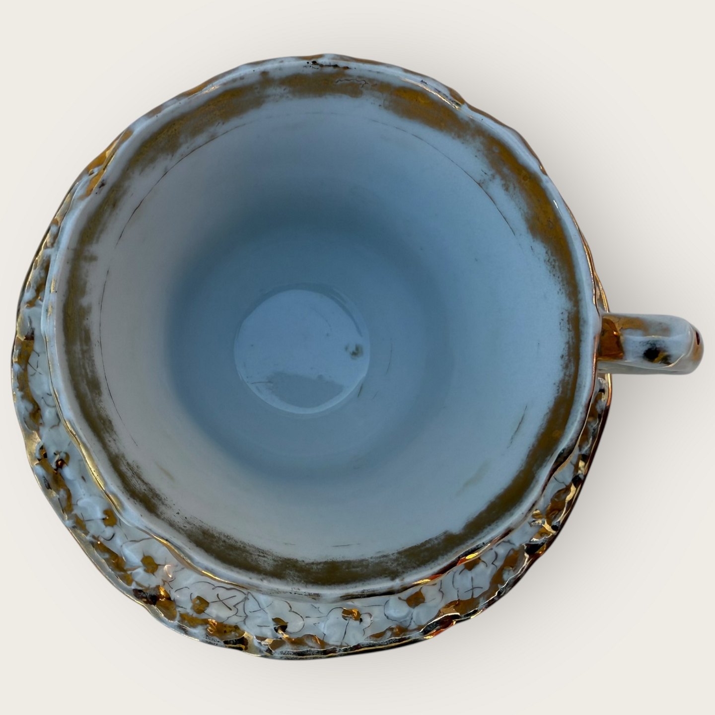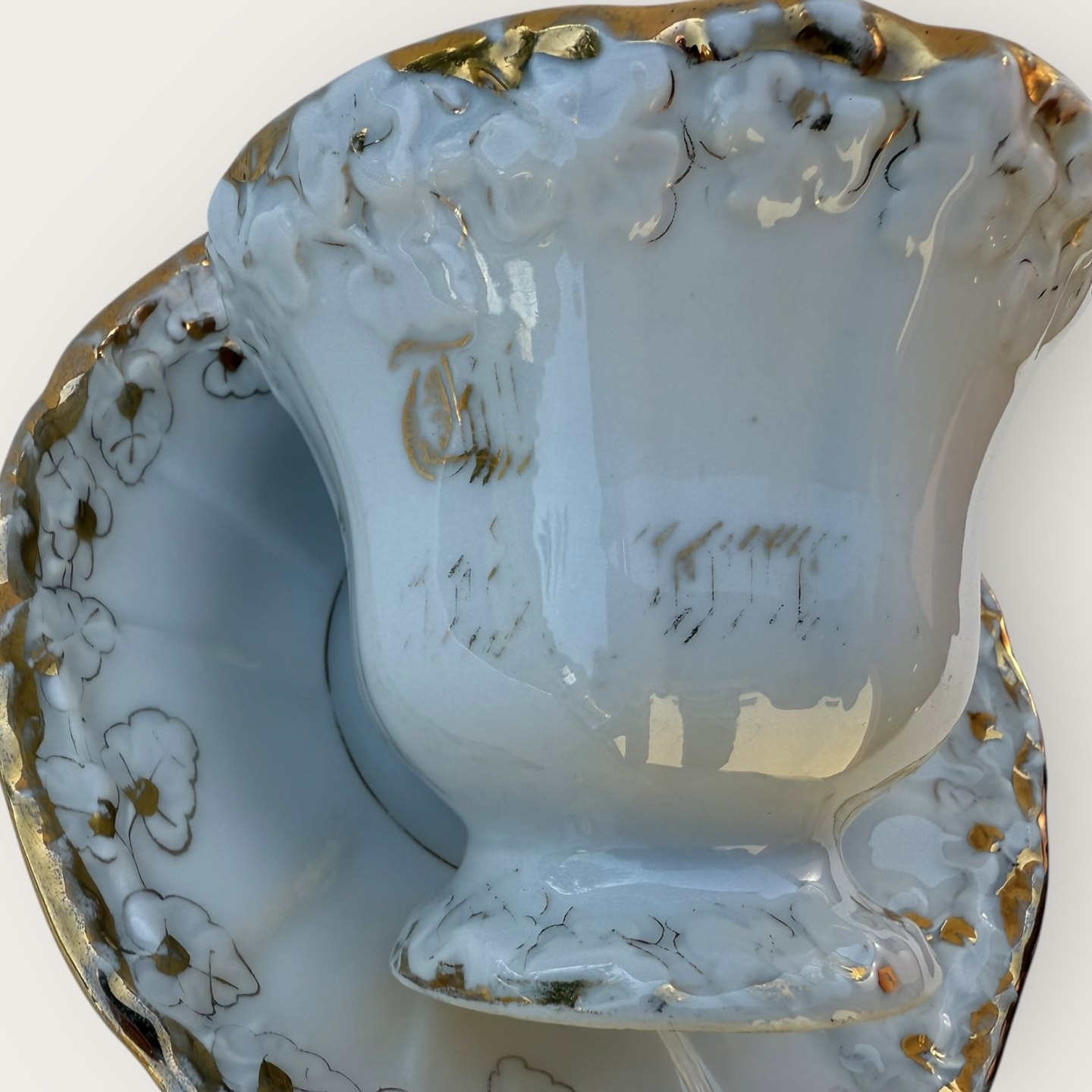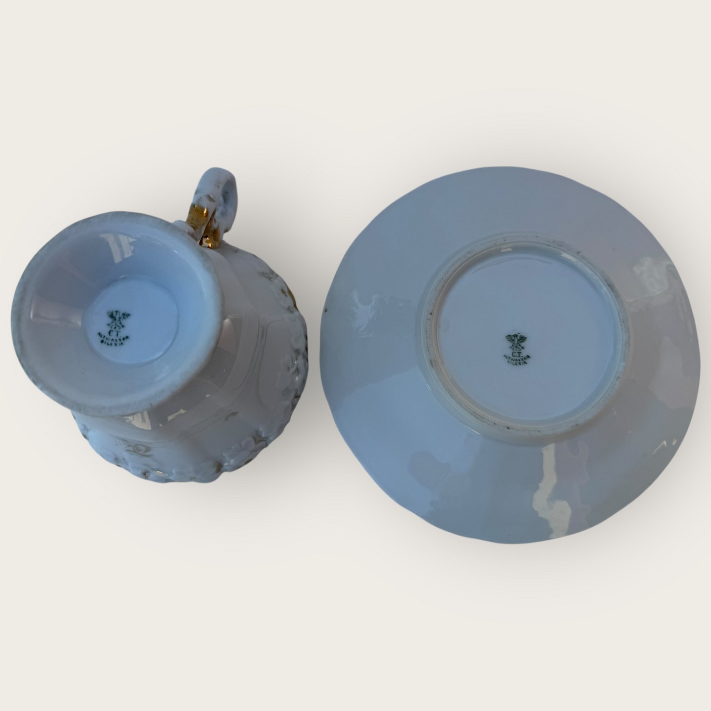 Description: C.T. Altwasser, Große Tasse mit Gold. Auf der Unterseite der Untertasse befindet sich ein kleiner Stern und etwas Patina auf dem Gold, unter anderem ist „In Memory“ fast abgenutzt. Tassenhöhe 9 cm, Durchmesser 11 cm.