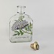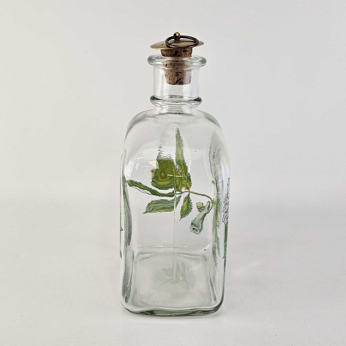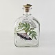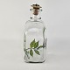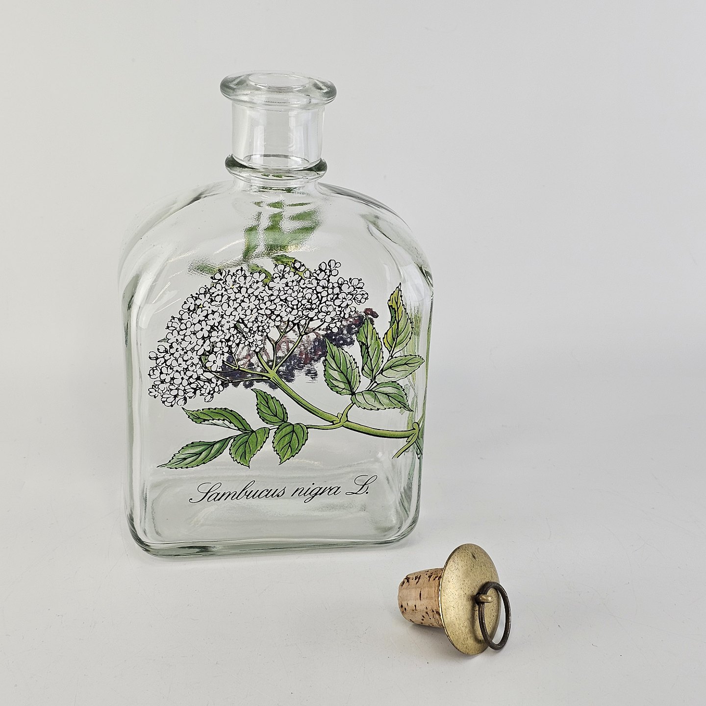 Beskrivelse: Karaffel i klart glas med korkprop fra serien Brændevins Amatøren, dekoreret med en gren af hyldeblomst og teksten Sambucus Nigra L.