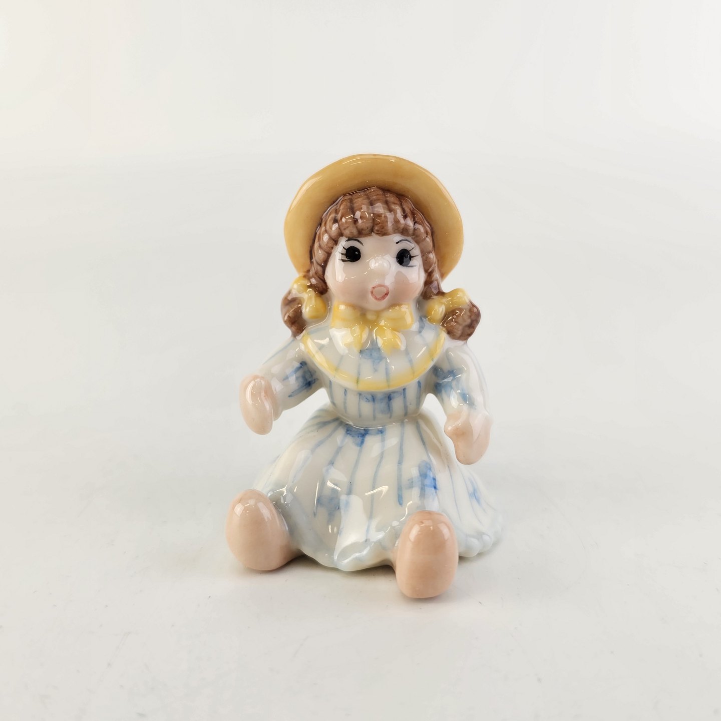 Beskrivelse: Figur af en siddende dukke i porcelæn fra serien Mini Collection Toys
