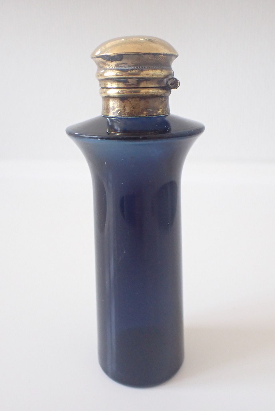 Beskrivelse: Parfumeflaske i blåt glas med messinglåg, engelsk ca. 1900. Højde:11,5 cm. I fin stand men mangler indre glasprop.