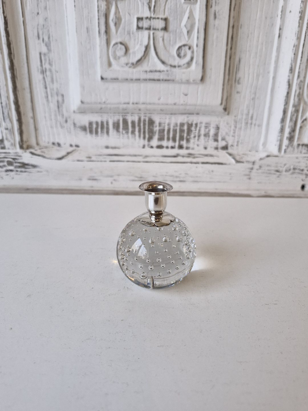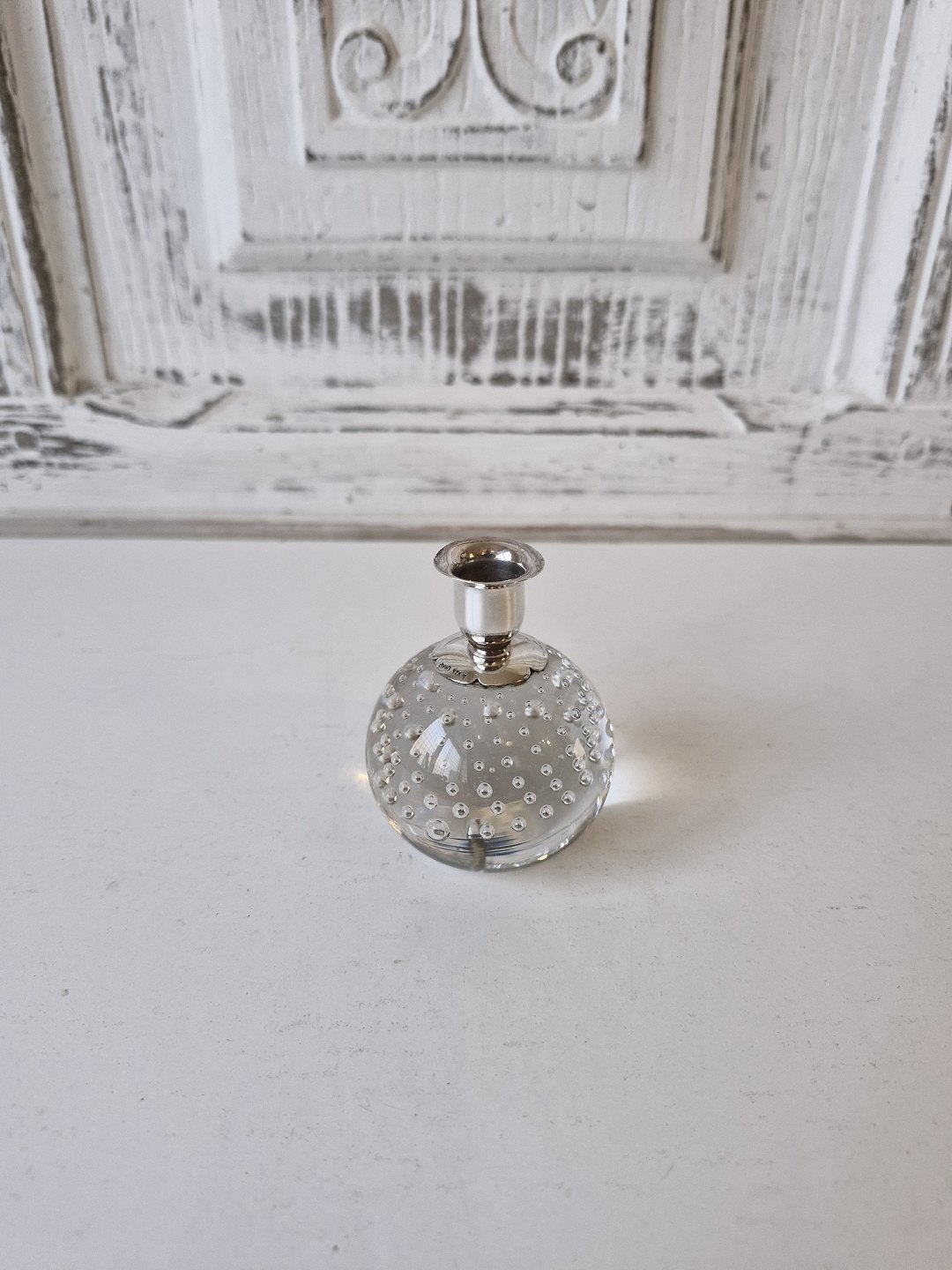 Kugleformet glaslysestage med lyspibe i sterlingsølv