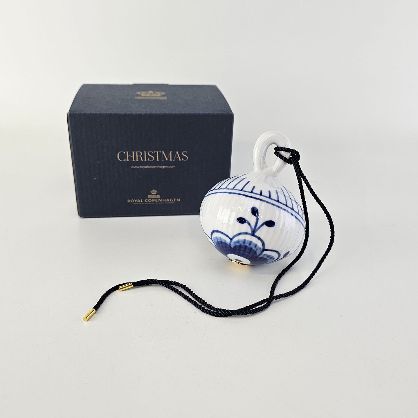 Beskrivelse: Julekugle af porcelæn med blå mega riflet musselmalet mønster