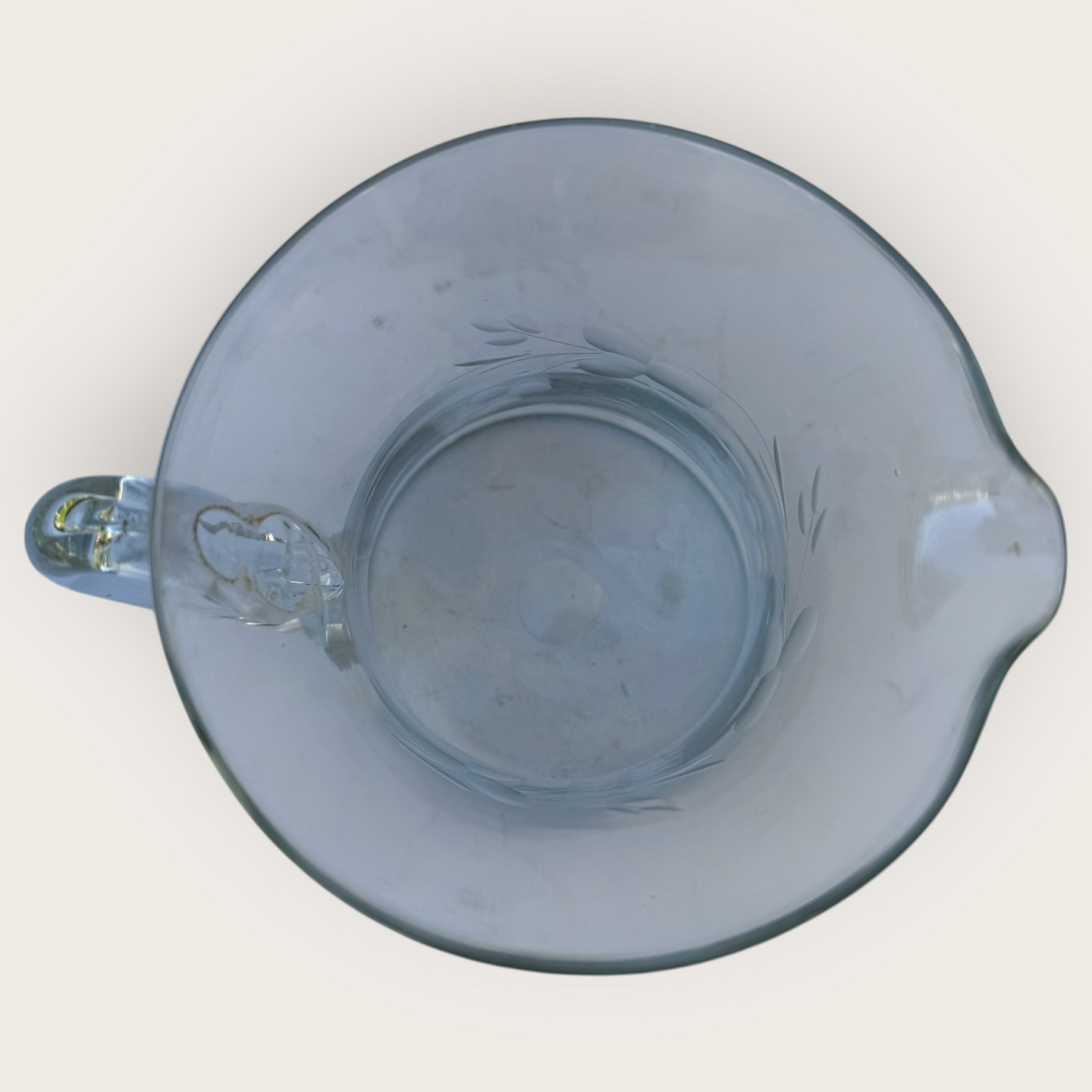 Beskrivelse: Bred glaskande med fine slibninger, Mål: HxBxD 17x19x13 cm, *Lidt kalk hvor hanken sidder fast på kanden(se foto) ellers pæn stand.
