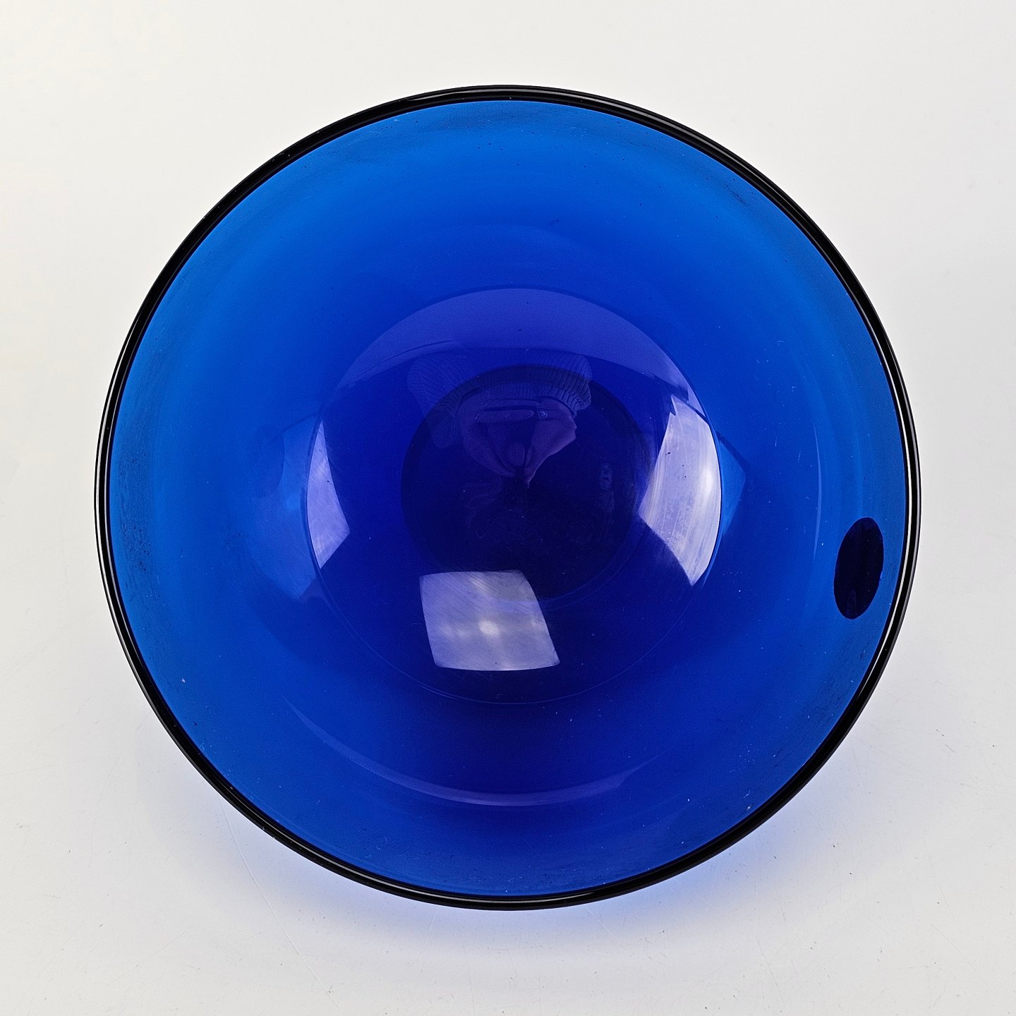 Beskrivelse: Harlekin skål i gennemsigtigt blåt glas med klart glas i bunden