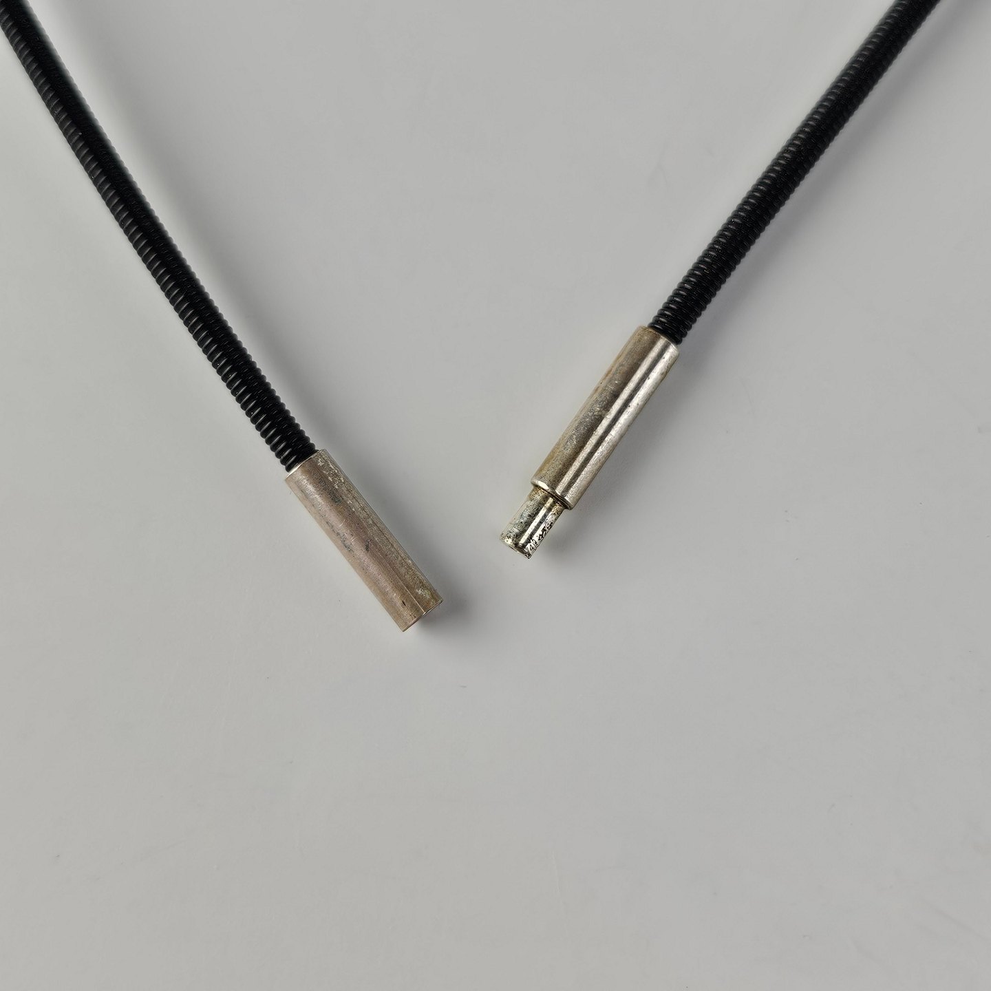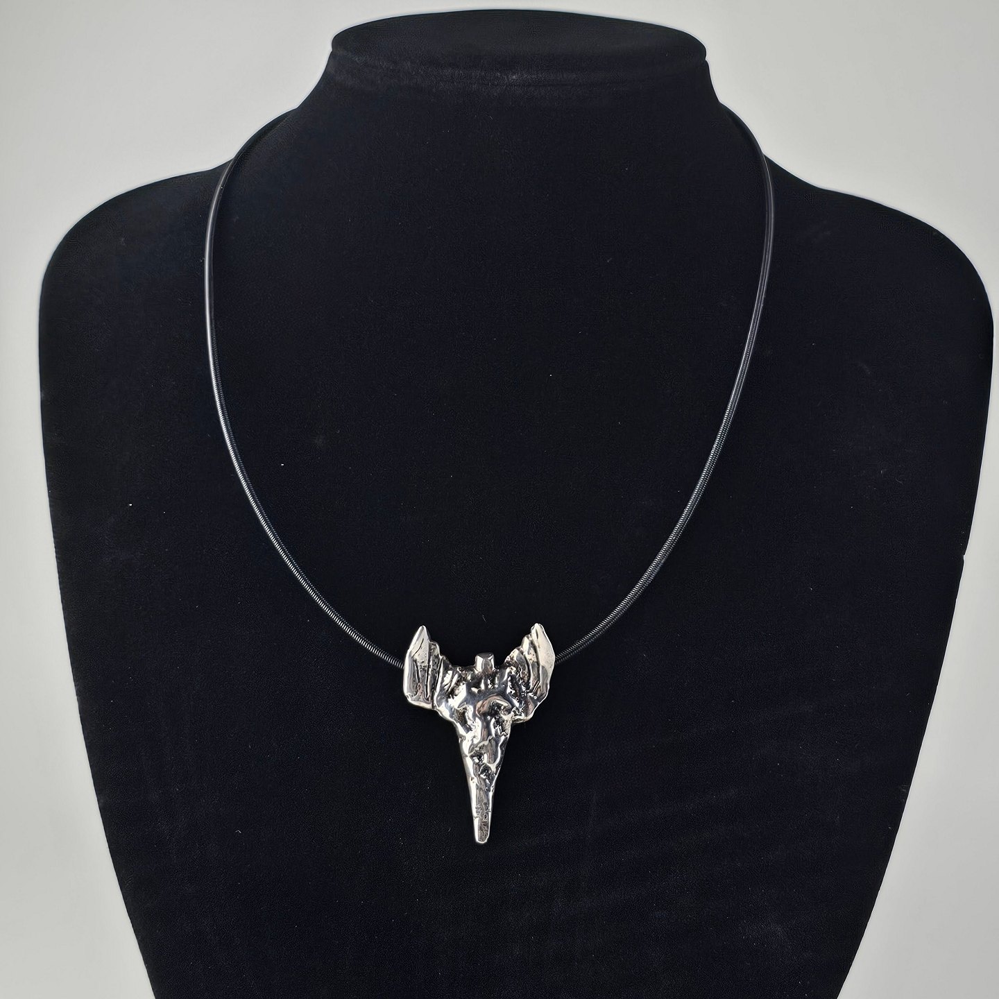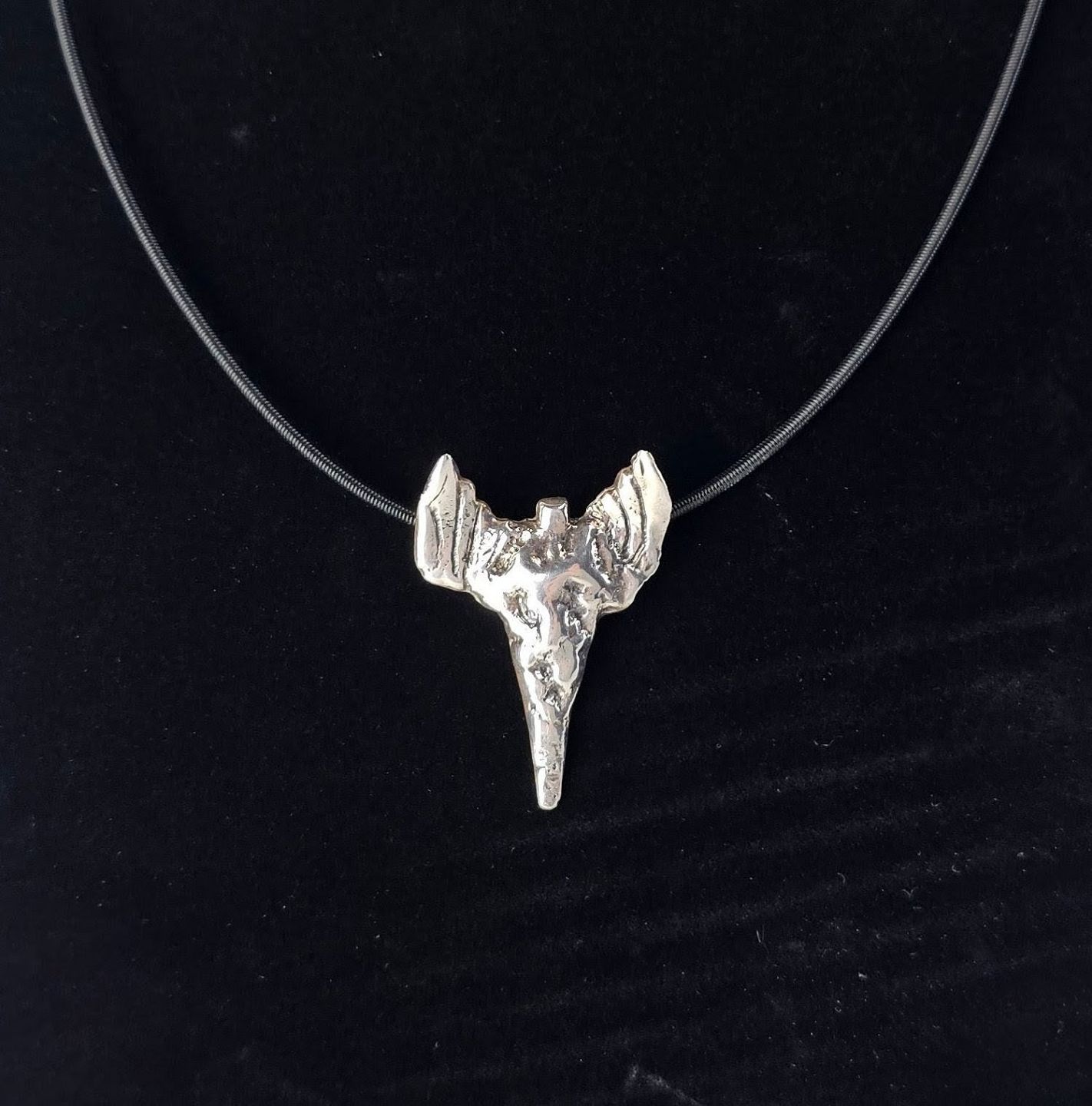 Beskrivelse: Halssmykke i sterling sølv med motiv af en abstrakt engel og læderrem, smykket er kaldet Nibe Englen