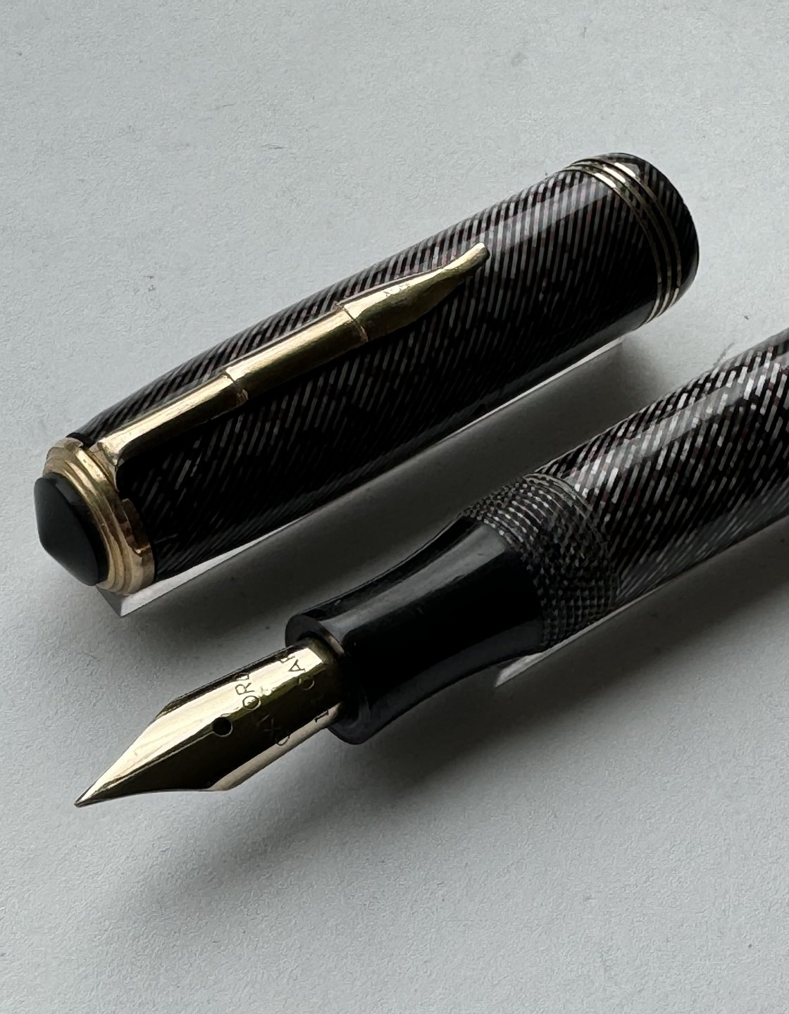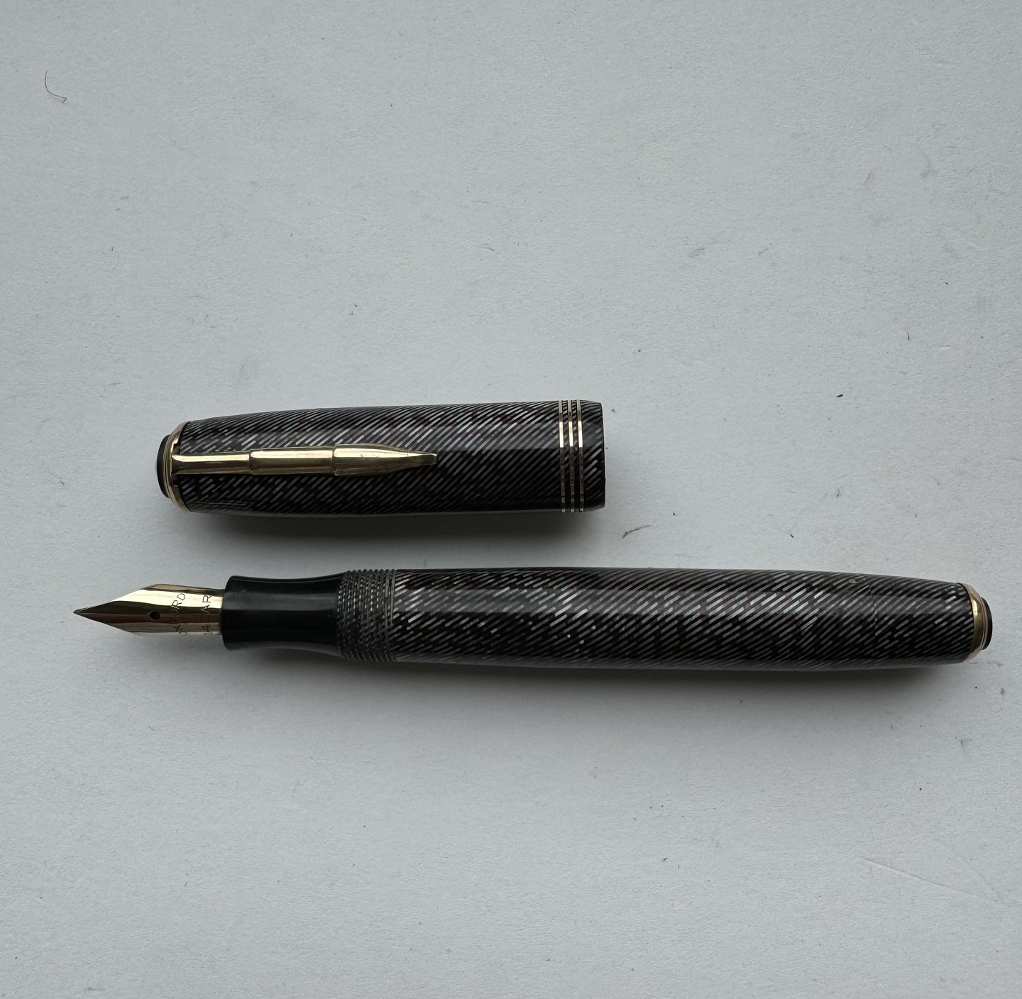 Beskrivelse: Sølv og grøn spiralstribet Sheffield Pen fyldepen fremstillet i 1940’erne. Spidsen er en 14 karat guldstoles fra Oxford. Muligvis et dansk produkt. Har F.eks. Lighed med fyldepenne fremstillet hos Penol. Fremstår i god stand. Fungerer ikke. Der skal indsættes ny gummisæk før end pennen kan optage blæk og skrive igen. Ny gummisæk kan indsættes mod et tillæg på kr. 250,- til fyldepennens pris. Mål: 12,2 cm