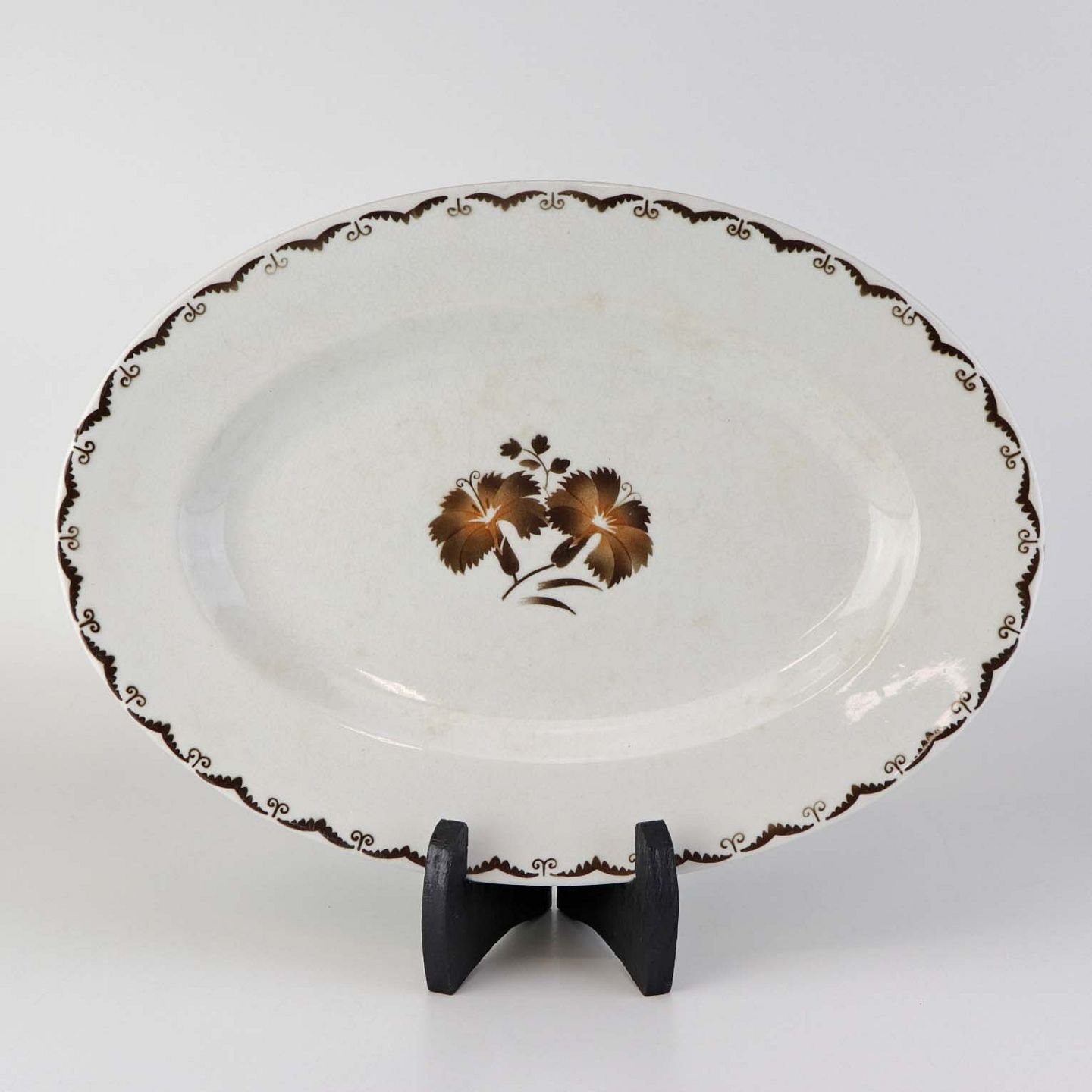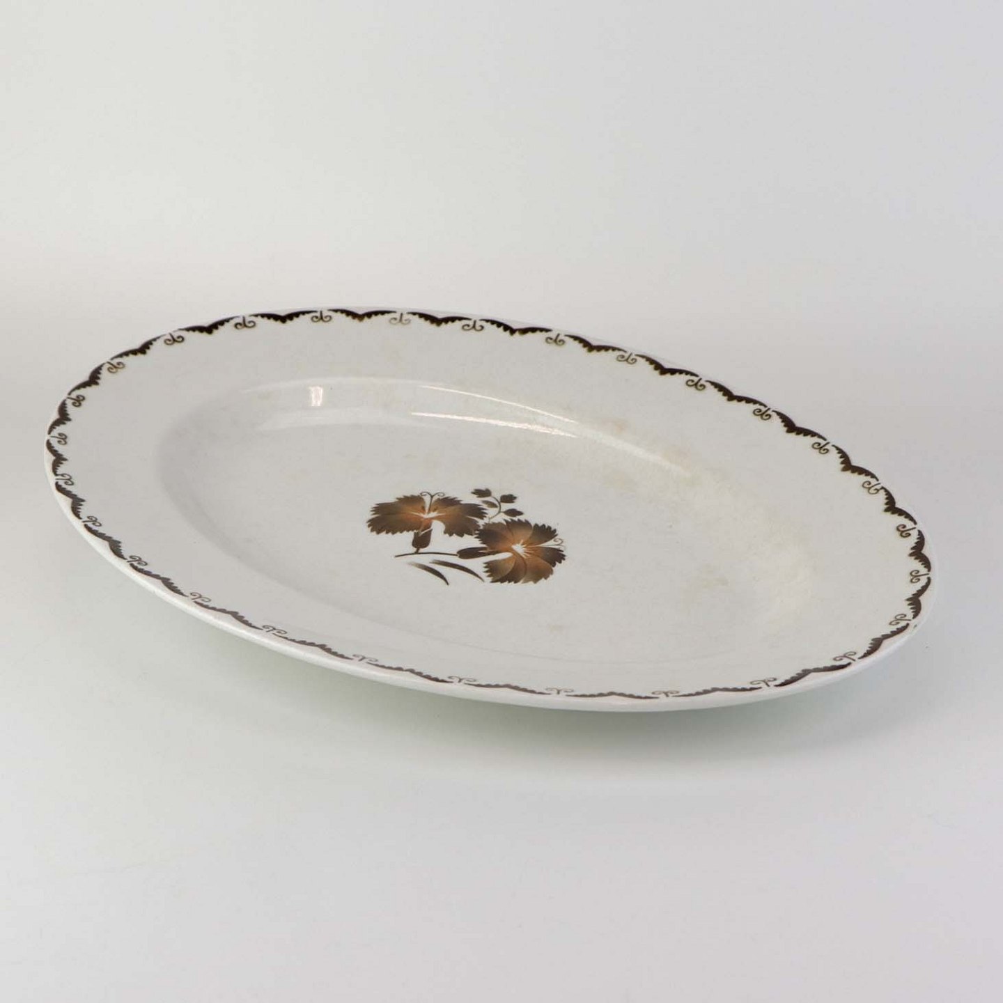 Beskrivelse: Ovalt fad i fajance fra stellet Convolvulus Nellike.