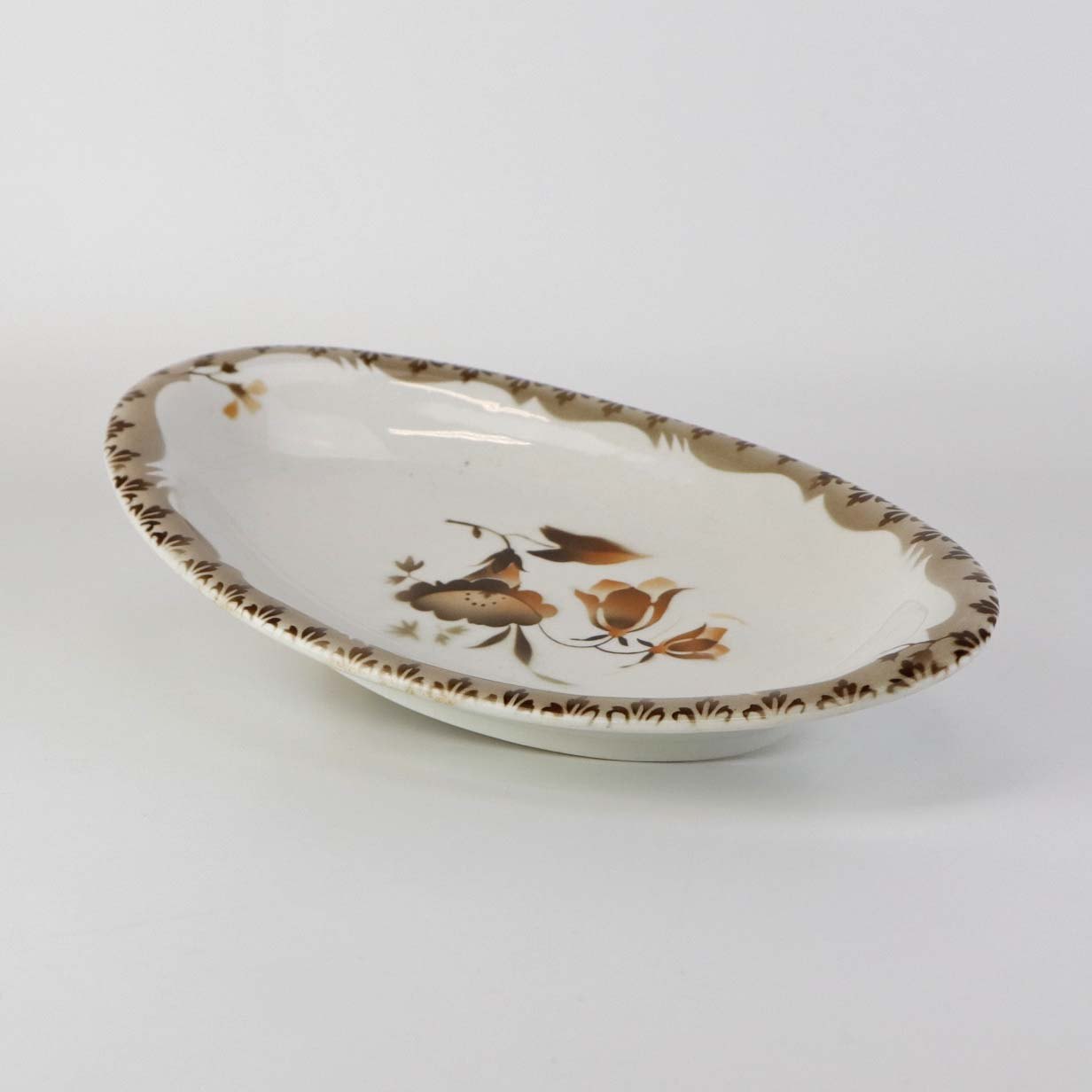 Beskrivelse: Lille ovalt fad i fajance fra stellet Convolvulus Snerle.