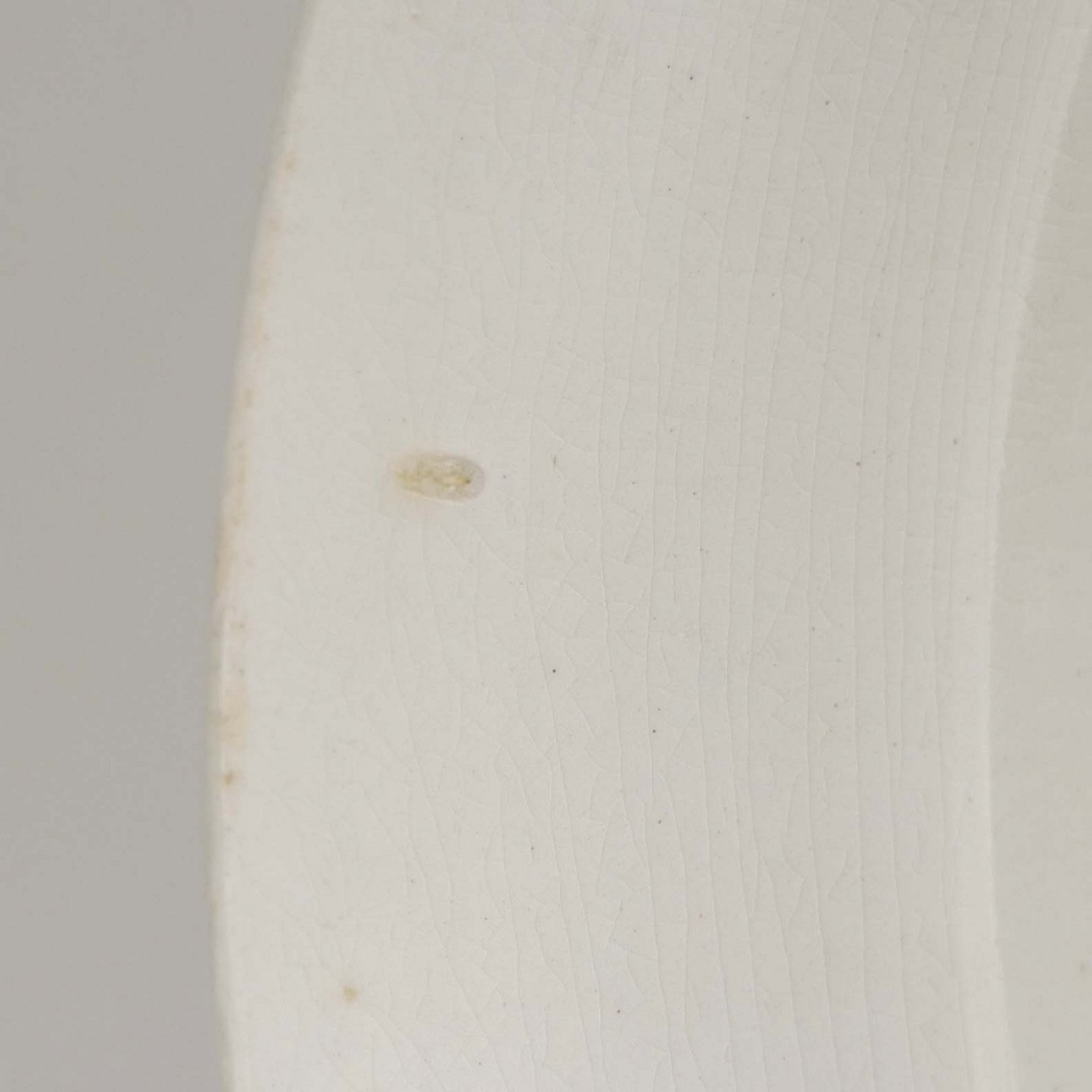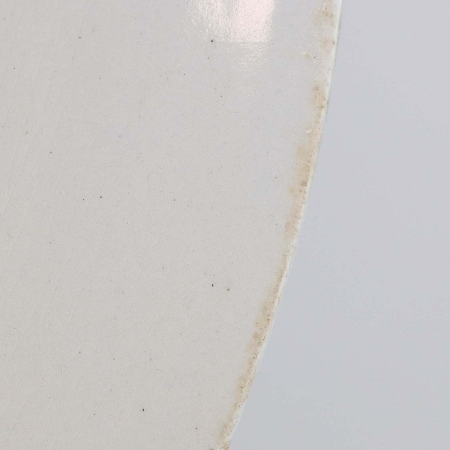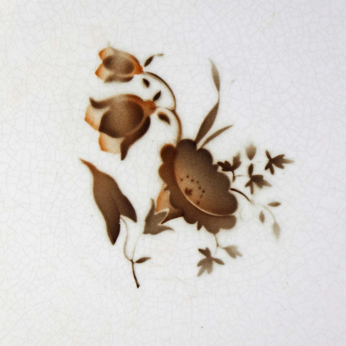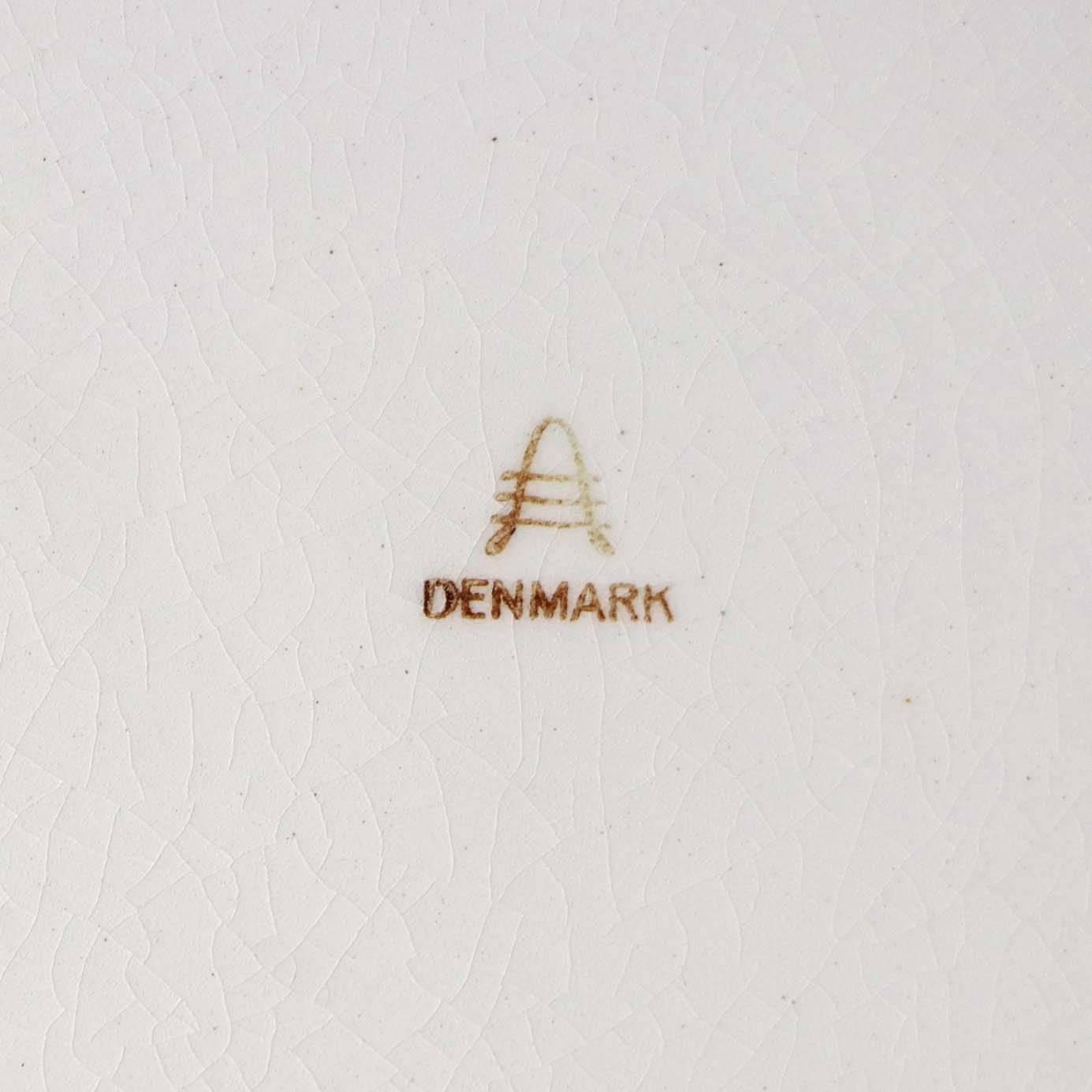 Fremstår med krakkeleringer i glasuren og mørkninger under glasuren samt på fadets kant på undersiden.
