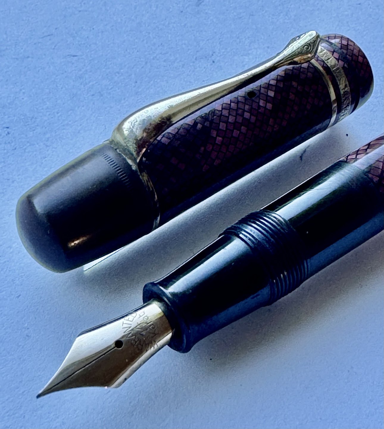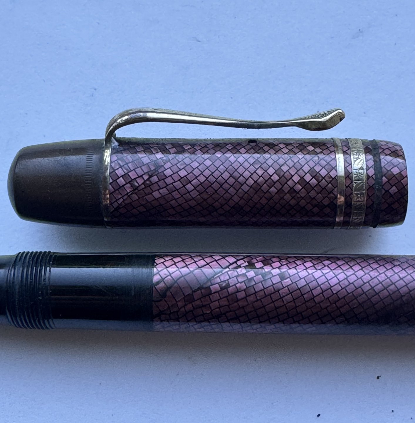 Description: ART DECO STYLE: Burgundy snakeskin fountain pen from around 1940. Appears in good condition without damage or repairs. “Push button” ink filler. Does not work. A new rubber sack must be inserted before it is functional again. This fountain pen is 12.5 cm long.