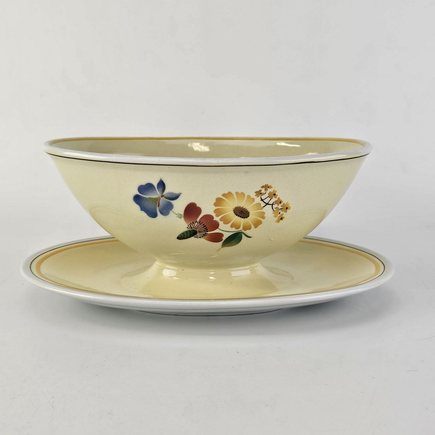 Stel i glat gul fajance med dekoration af farverige og forskelligartede blomster