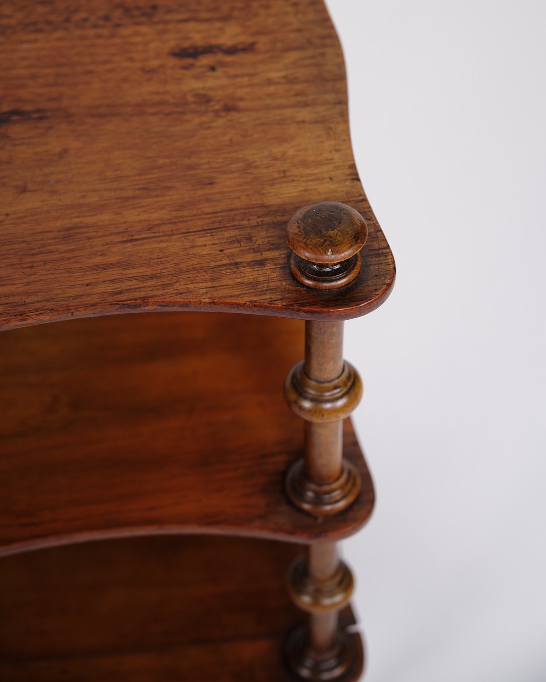Beskrivelse: etagere/reol fra 1800-tallet, udført i mahogni. Møblet er indrettet med tre hylder og detaljerede drejede søjler. Nederst er det monteret med små hjul, hvilket giver både funktionalitet og mobilitet.
