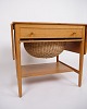 Beskrivelse: Sybord, model AT-33, designet af Hans J. Wegner og produceret af Andreas Tuck i 1950’erne. Bordet er udført i sæbebehandlet egetræ og indrettet med en praktisk hylde. Bordpladen kan udvides fra 64,5 cm til 118,5 cm, hvilket gør det både fleksibelt og funktionelt.