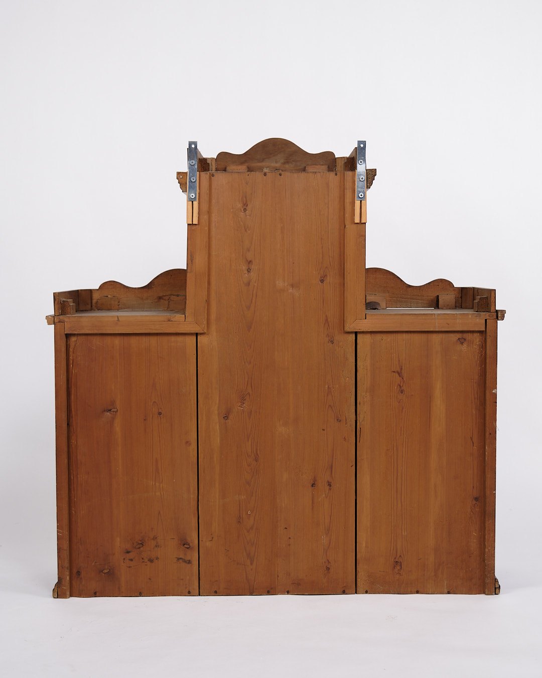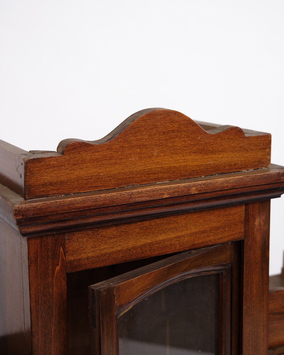 Beskrivelse: væghængt vitrineskab fra 1890’erne, udført i håndpoleret mahogni. Skabet har klassiske proportioner og fremstår med et tidstypisk design fra slutningen af 1800-tallet, hvor funktionalitet og dekorativt udtryk gik hånd i hånd.