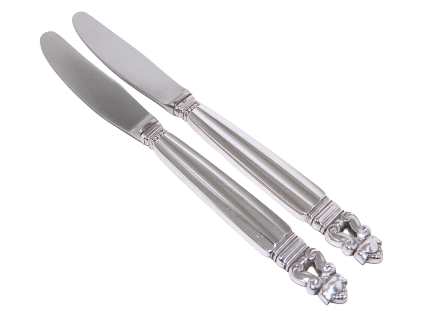 Beskrivelse: Georg Jensen Konge Sterlingsølv, frokostkniv med kort knivblad og grillskær.