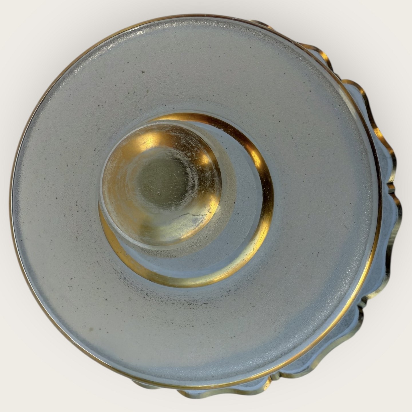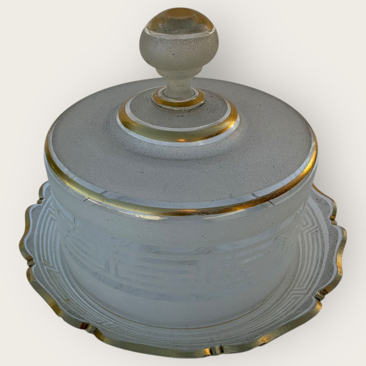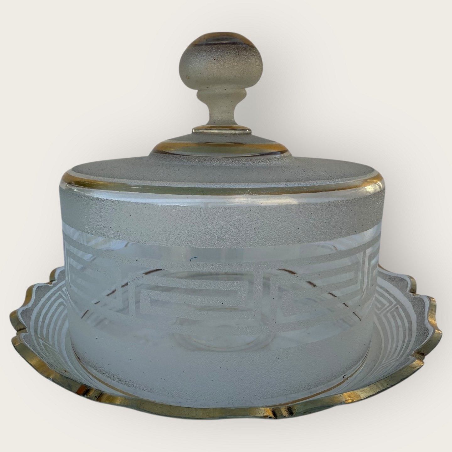 Beskrivelse: Klokke til madvarer i frostet glas med guldbemaling, lidt patinering på guldet ellers fin stand, diameter 23cm, højde 15cm