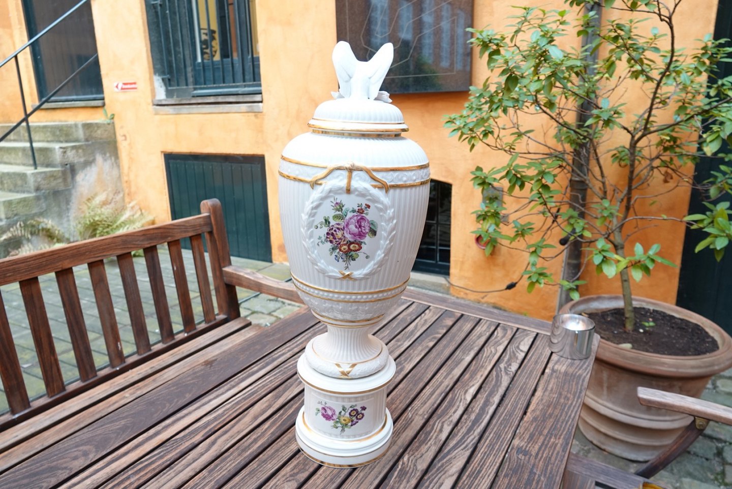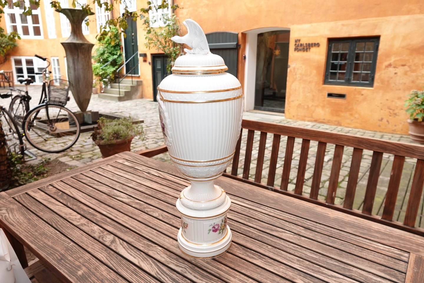 Description: Royal Copenhagen, enormous lidded jar with eagle on top. It is decorated with multicolored flowers as Sachian Flower.