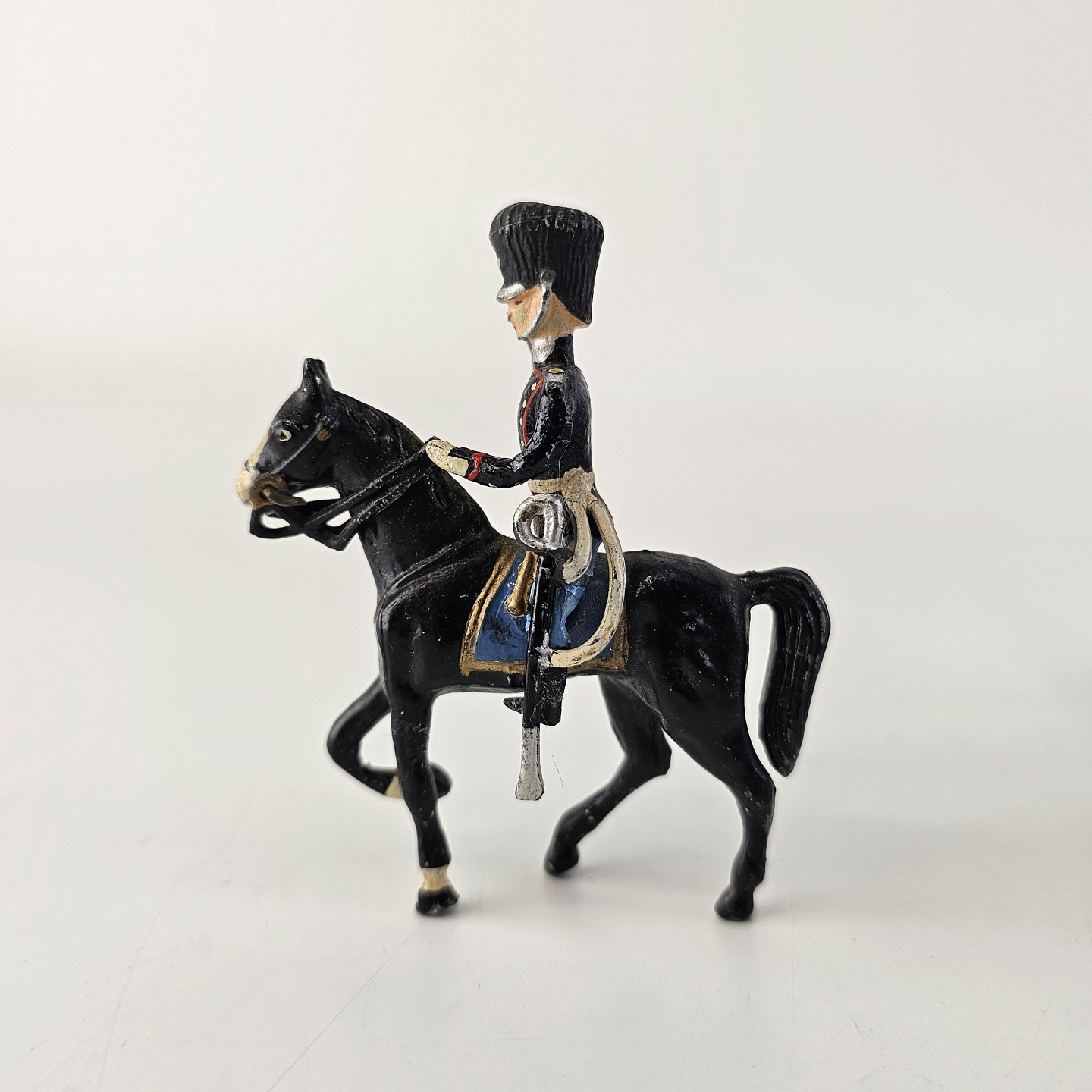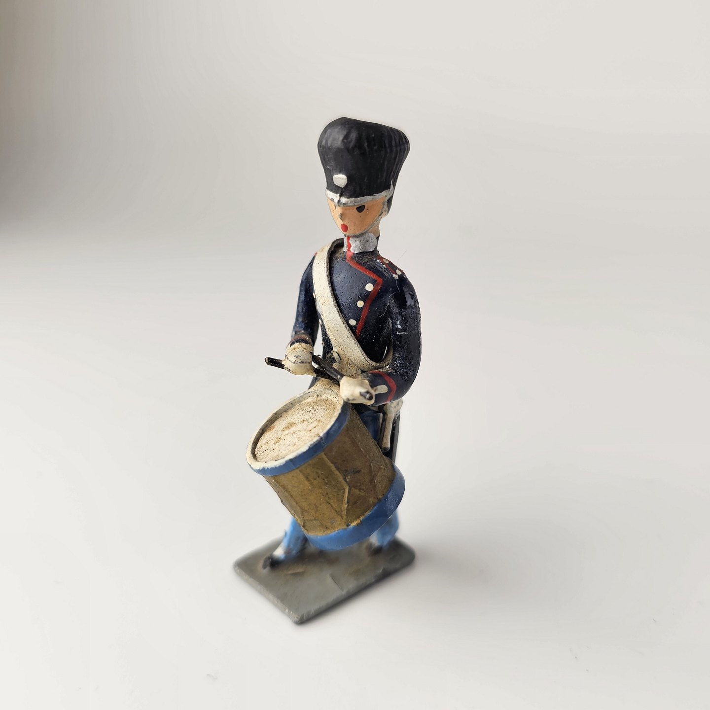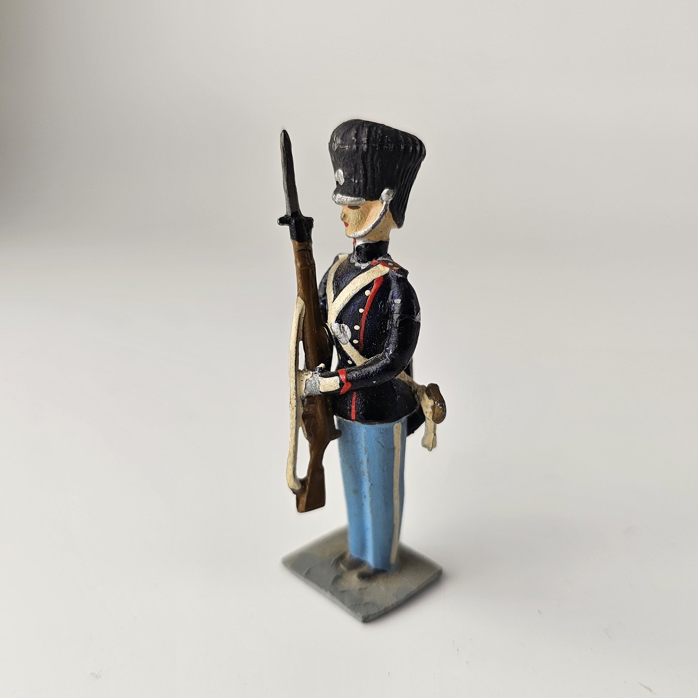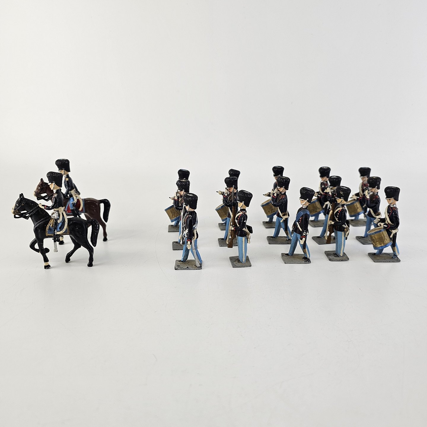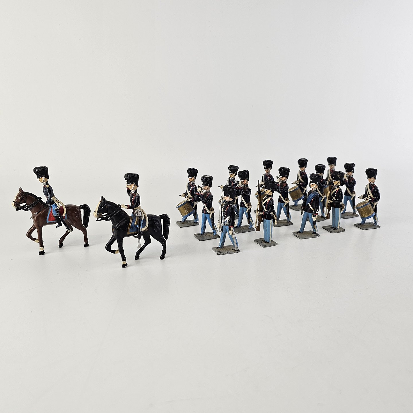 Beskrivelse: 17 figurer af livgarder med bjørnehuer i tin, to til hest og 15 gående med trommer, fløjter, eller våben