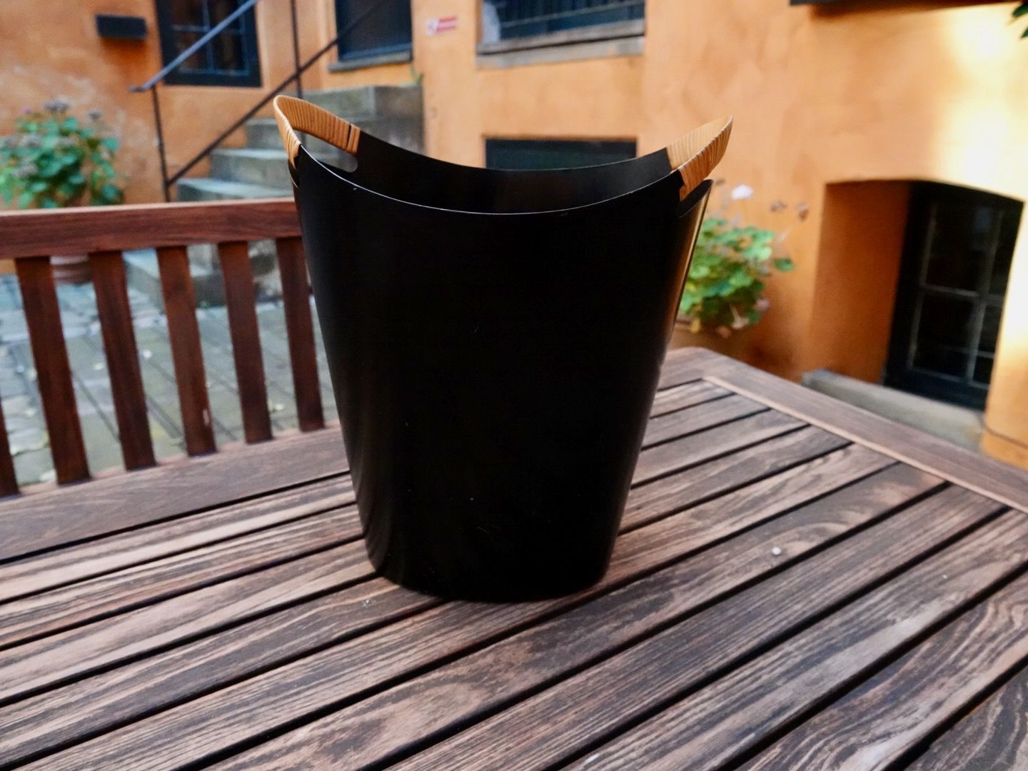 Beskrivelse: Papirkurv i sort metal med basthanke.