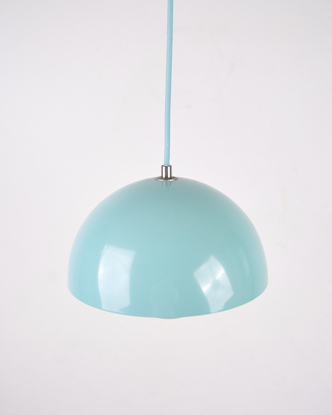 Description: Flowerpot pendant lamp, model VP1, designed by Verner Panton in 1968 and produced by &Tradition. The lamp is made of baby blue lacquered metal with the iconic double shade design.