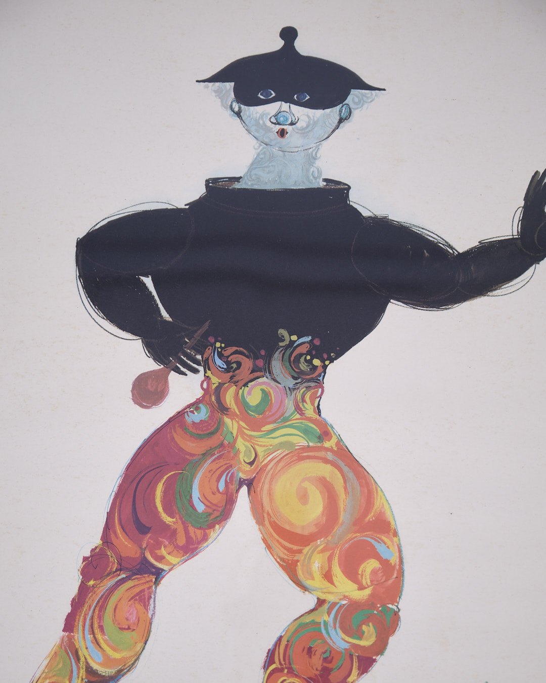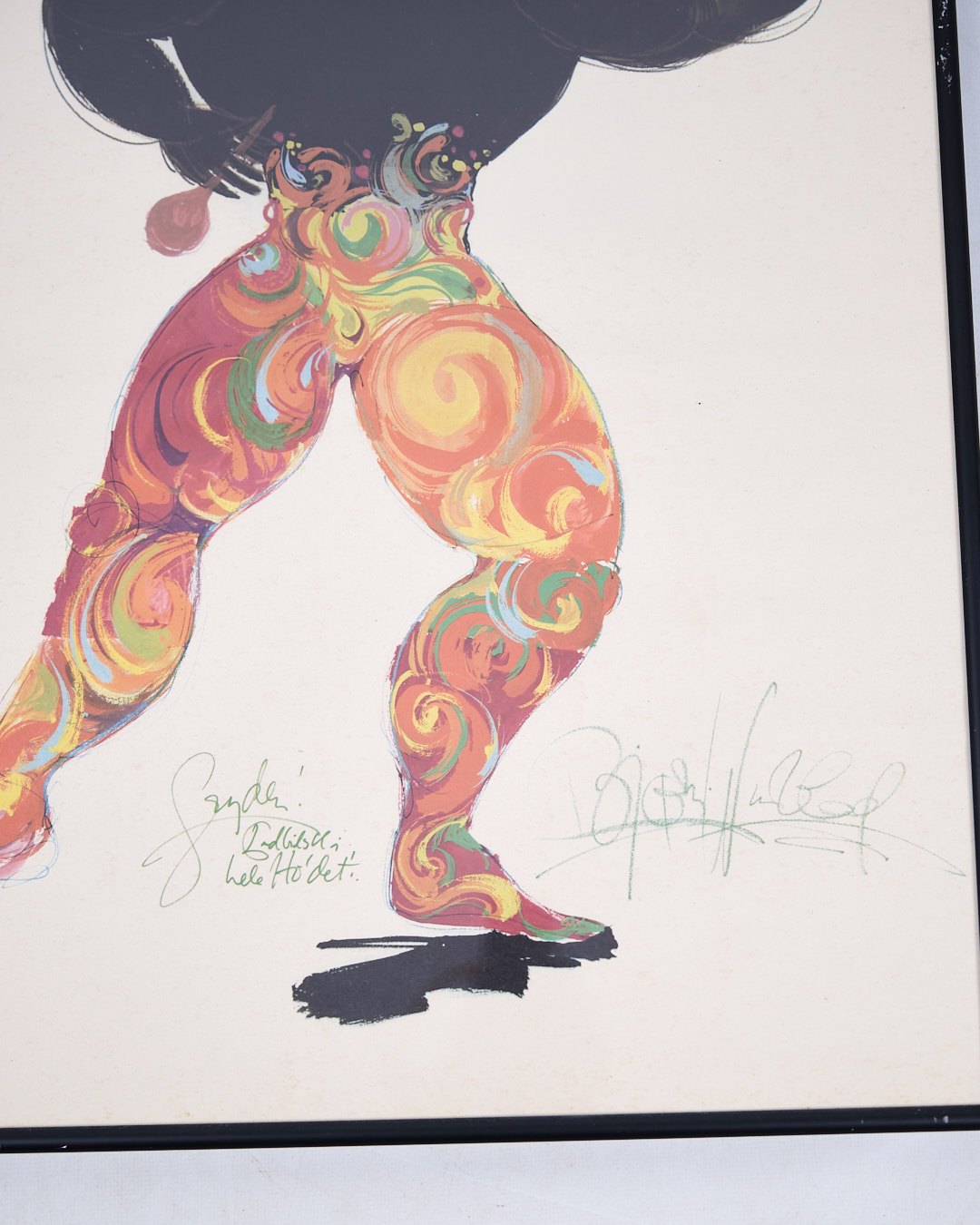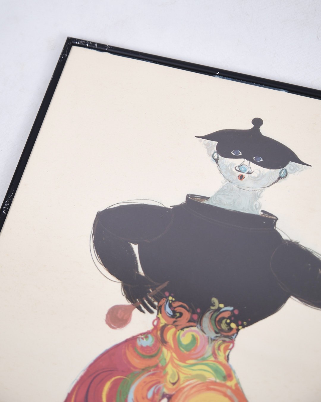 Beskrivelse: Litografisk tryk signeret af Bjørn Wiinblad. Indrammet i sort ramme med kunstnerens karakteristiske motiv.