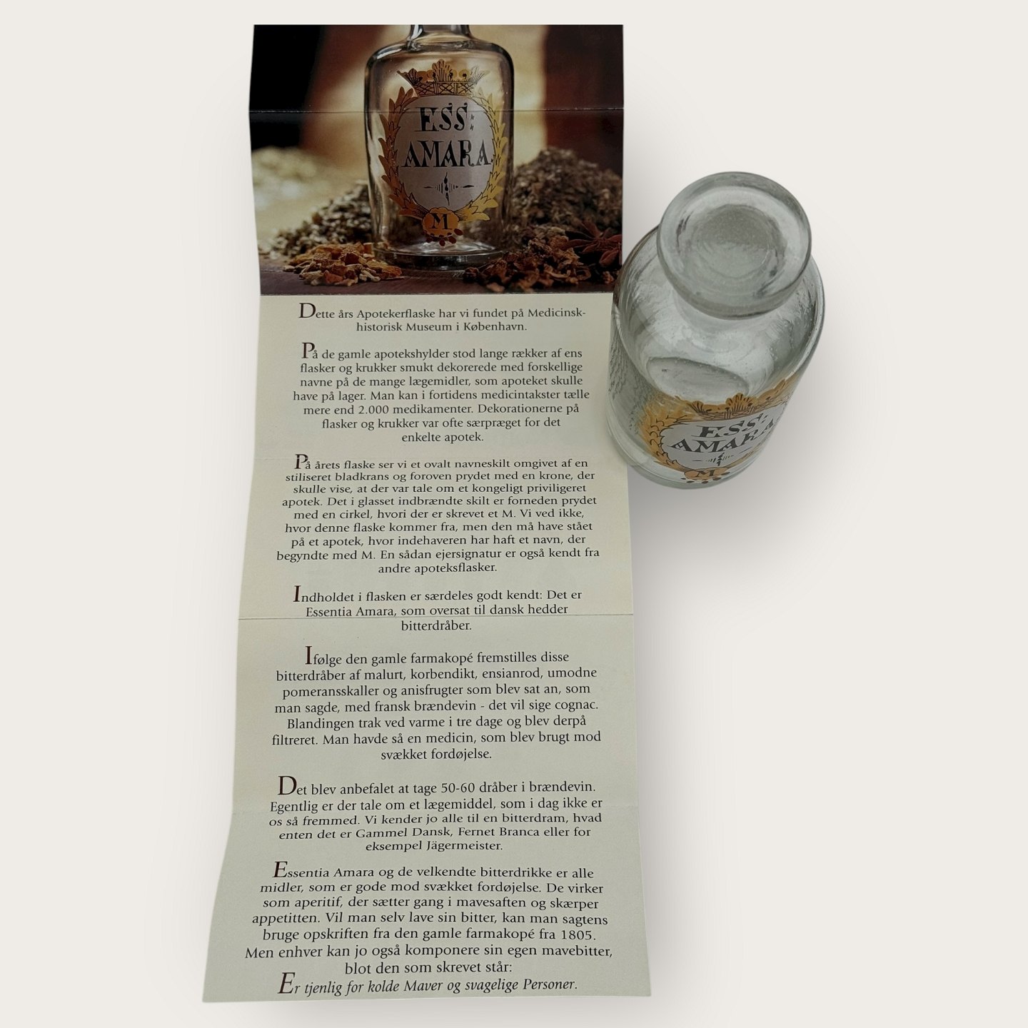 Description: Holmegaard apothecary bottle from 1997, Ess Amara, Dimensions: 13x5cm, the bottles are mouth-blown copies of original old apothecary bottles, Signed Hg97.