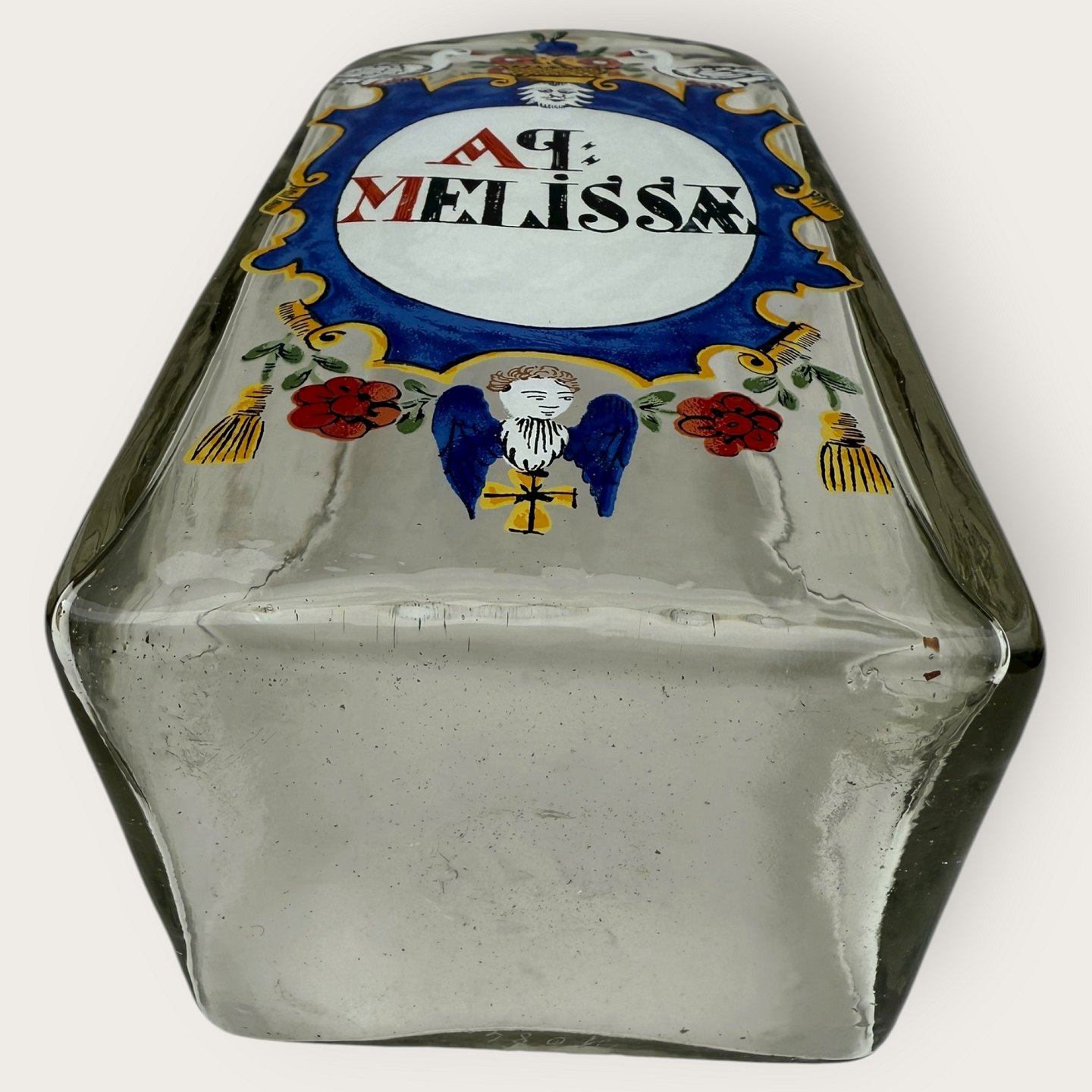 Description: Holmegaard apothecary bottle from 1986, AP Melissæ, Dimensions: 23x10x9cm, the bottles are mouth-blown copies of original old apothecary bottles, Signed Hg86.