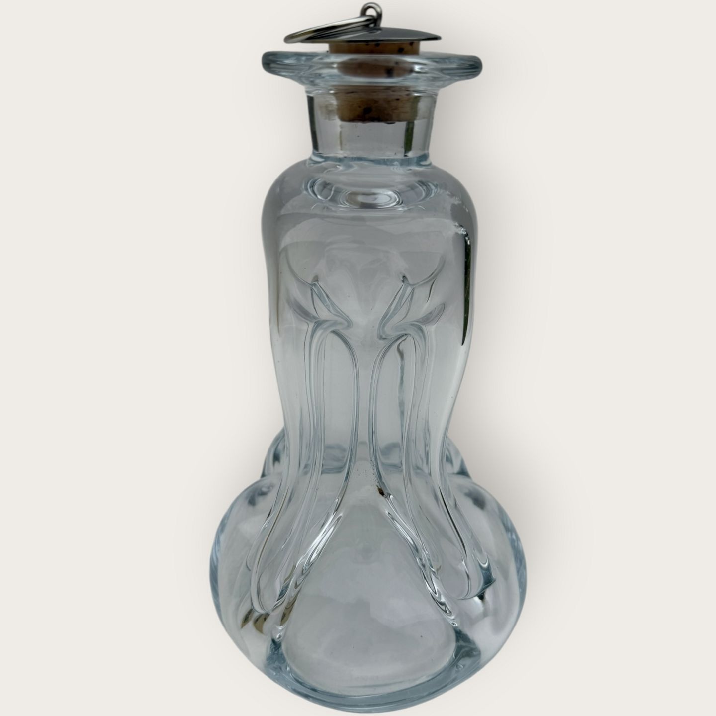 Beskrivelse: Holmegaard, klukflaske som er bred forneden, 20 x 11,5cm, fin stand