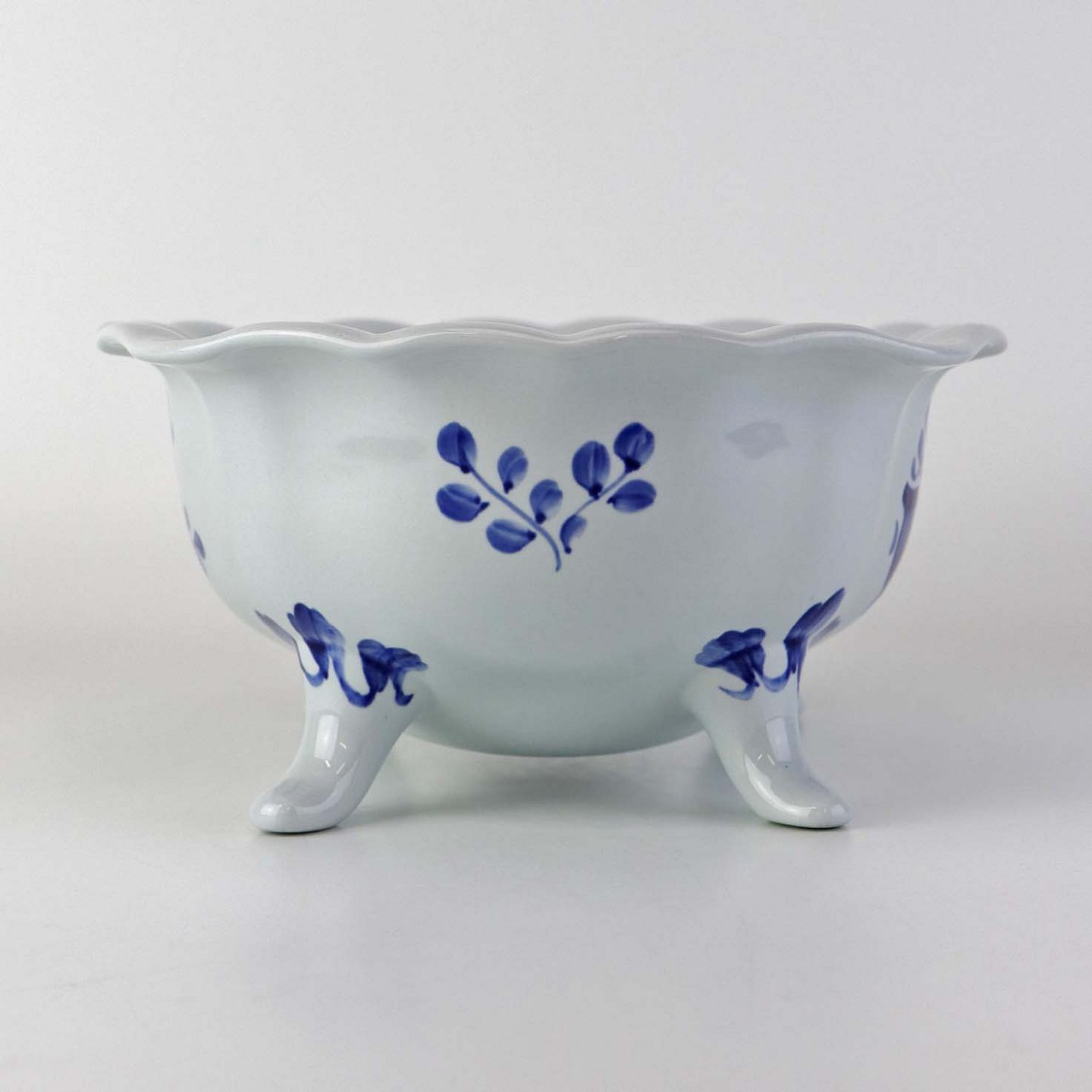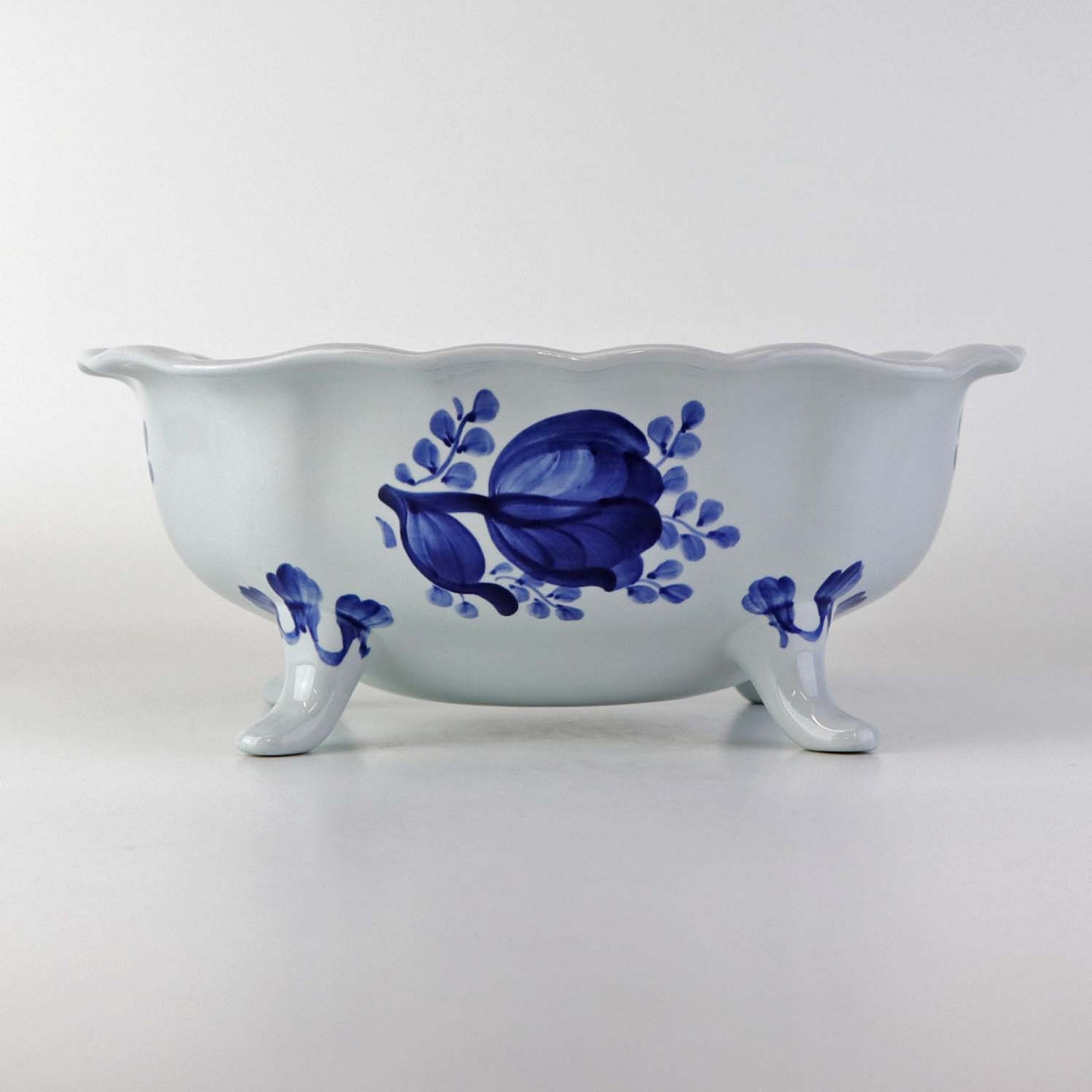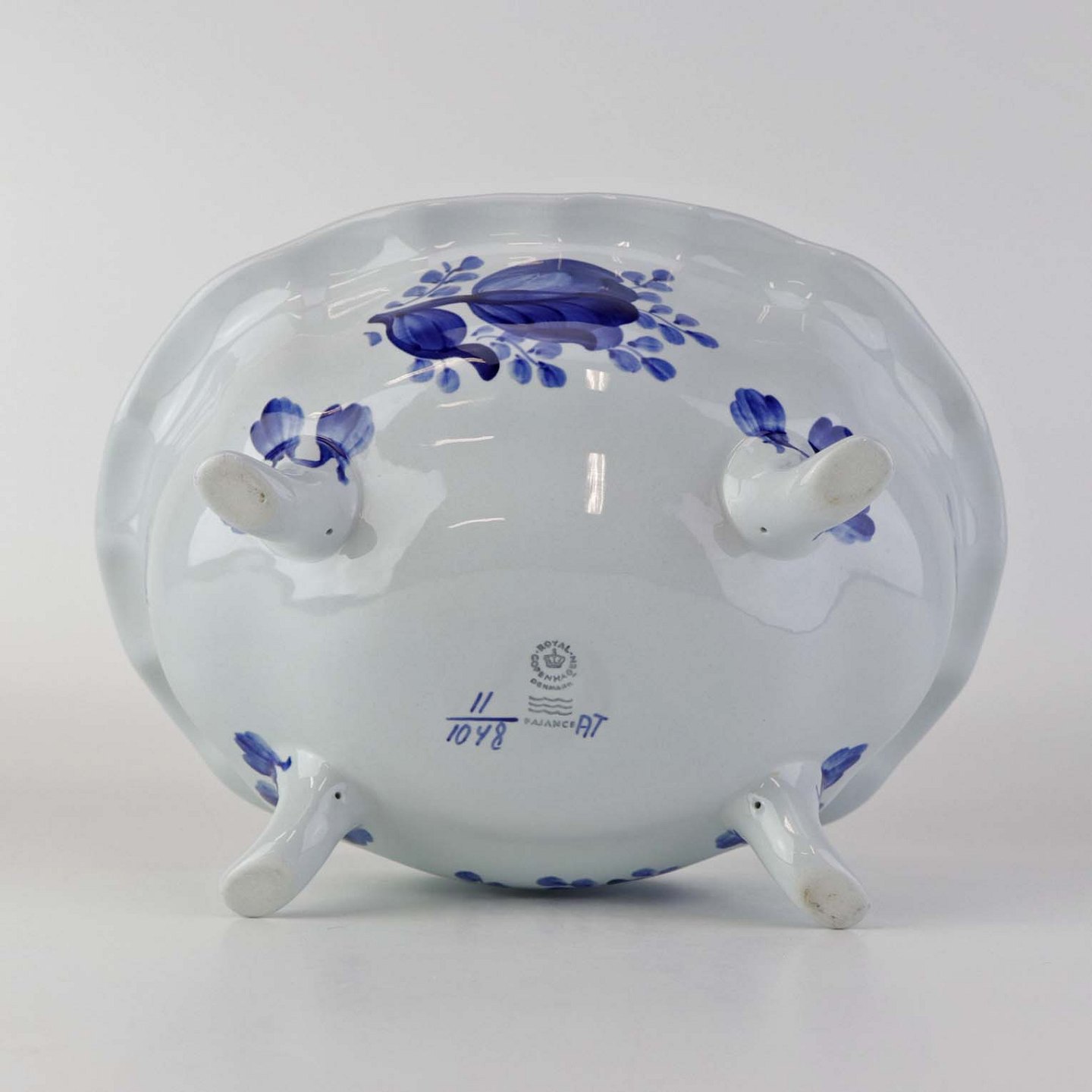 Beskrivelse: Skål på fire fødder i fajance fra stellet Blå Tranquebar. Nr. 11/1048