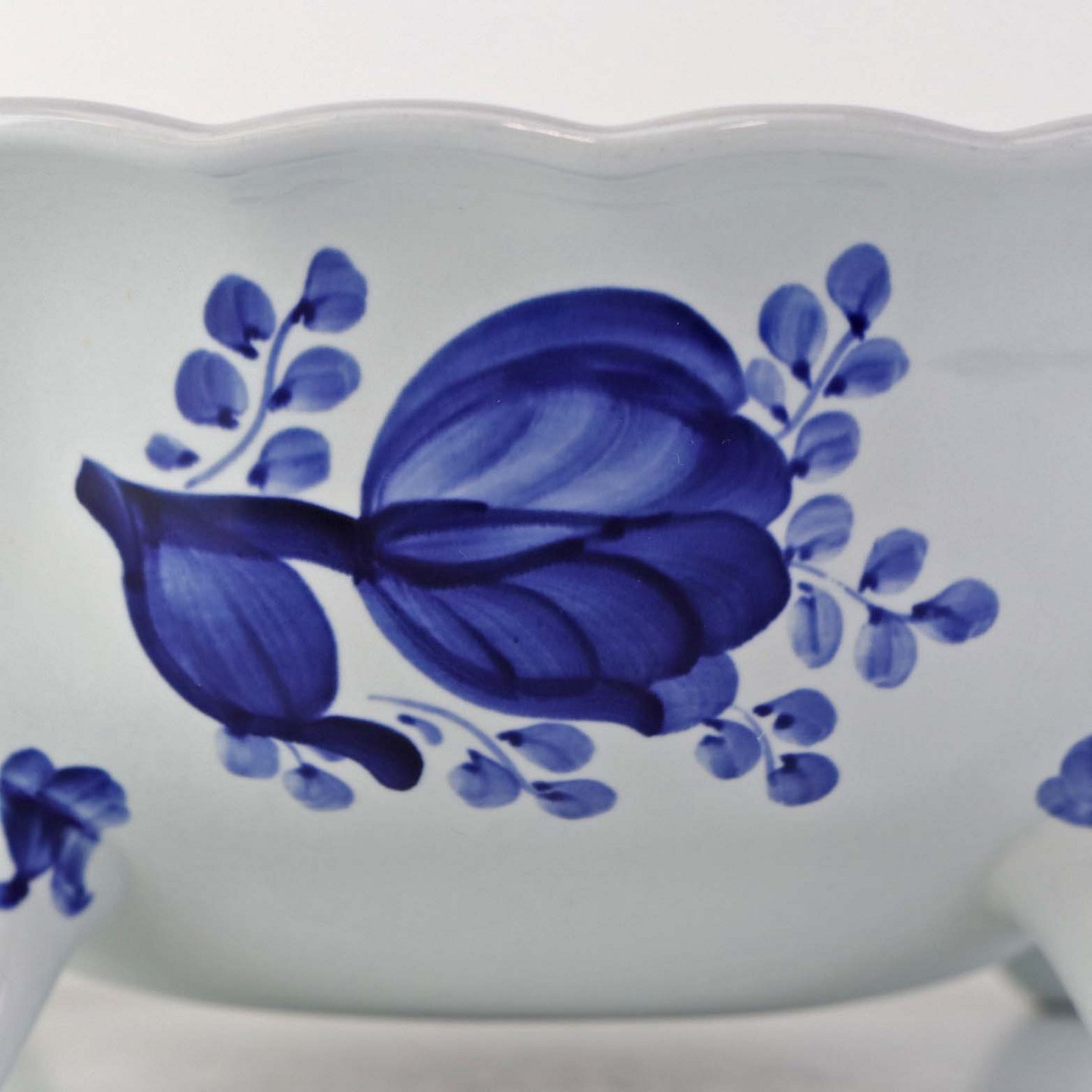 Glat Lyst fajance med blå dekoration af blomster og blå bort.