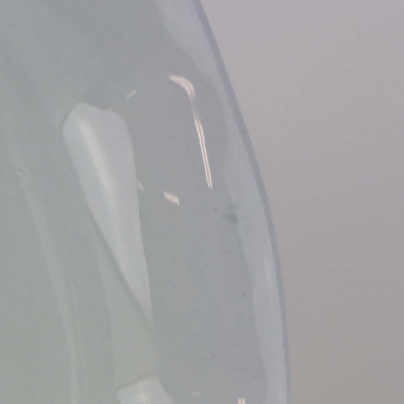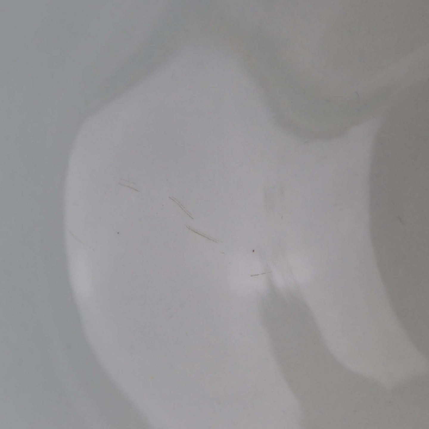 Fremstår med enkelte ridser i bunden af skålen samt mindre område med svag blå farve under glasuren.