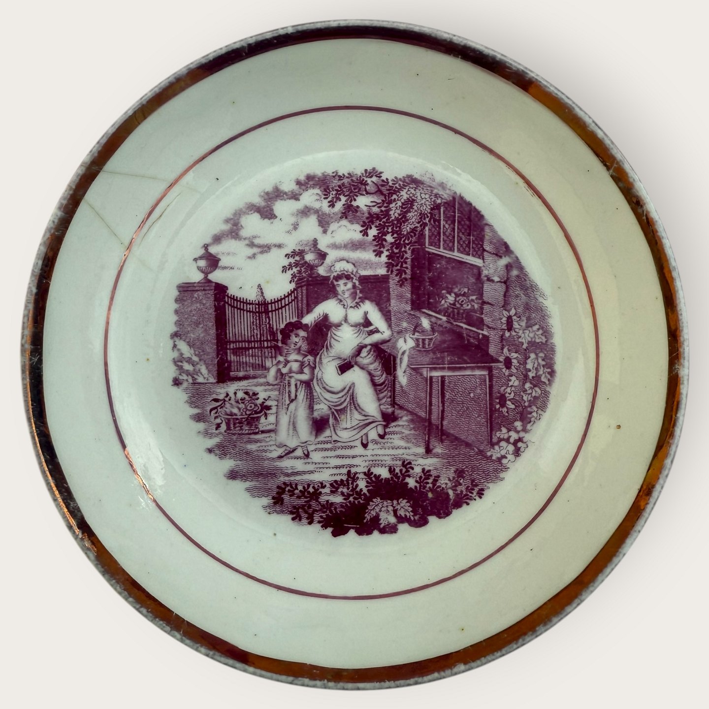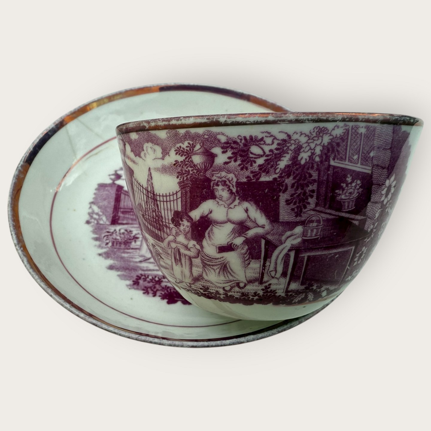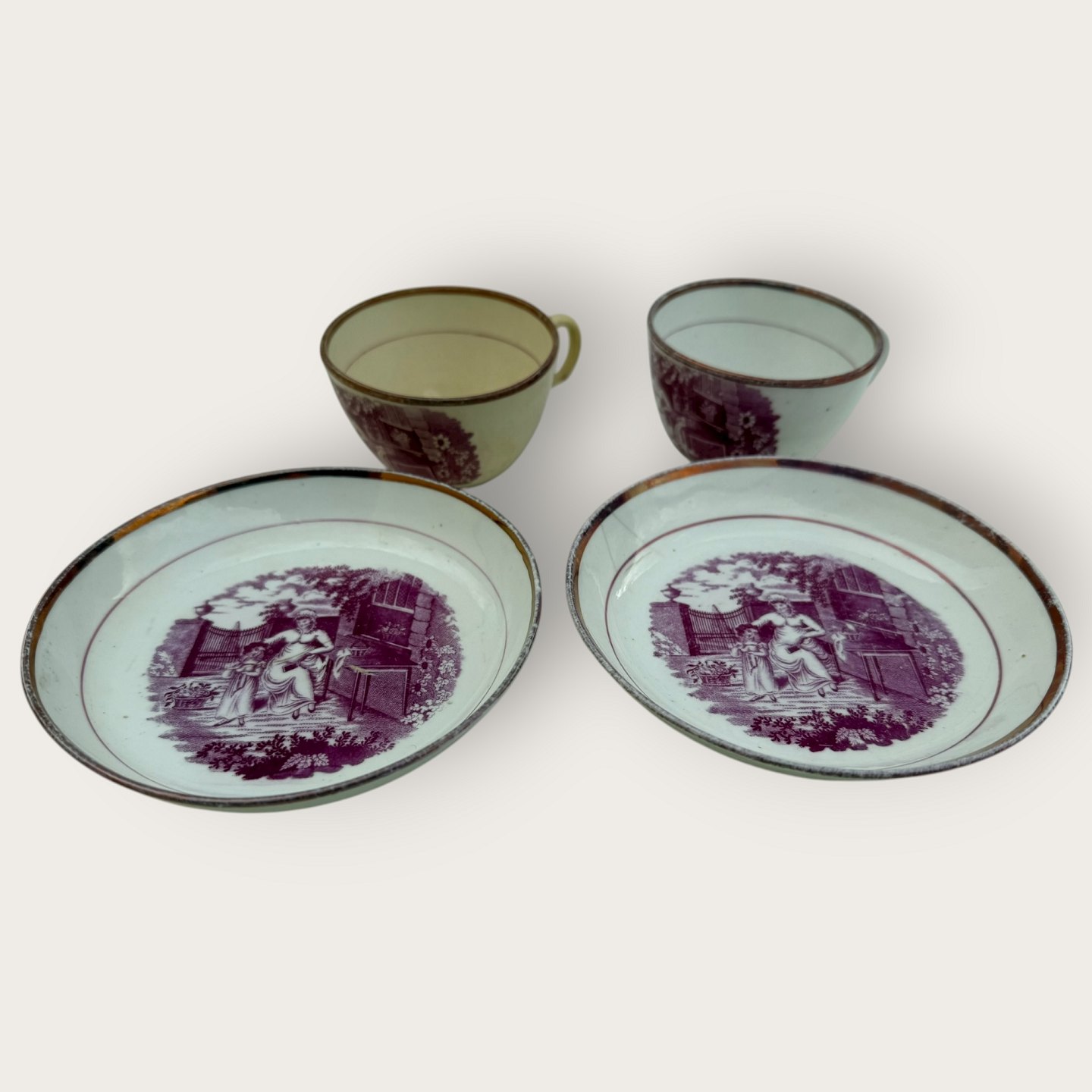 Description: 2 antique English porcelain cups with saucers, Staffordshire cups with a motif of mother and child, appear with scratches/age-related minor flaws - see photo.