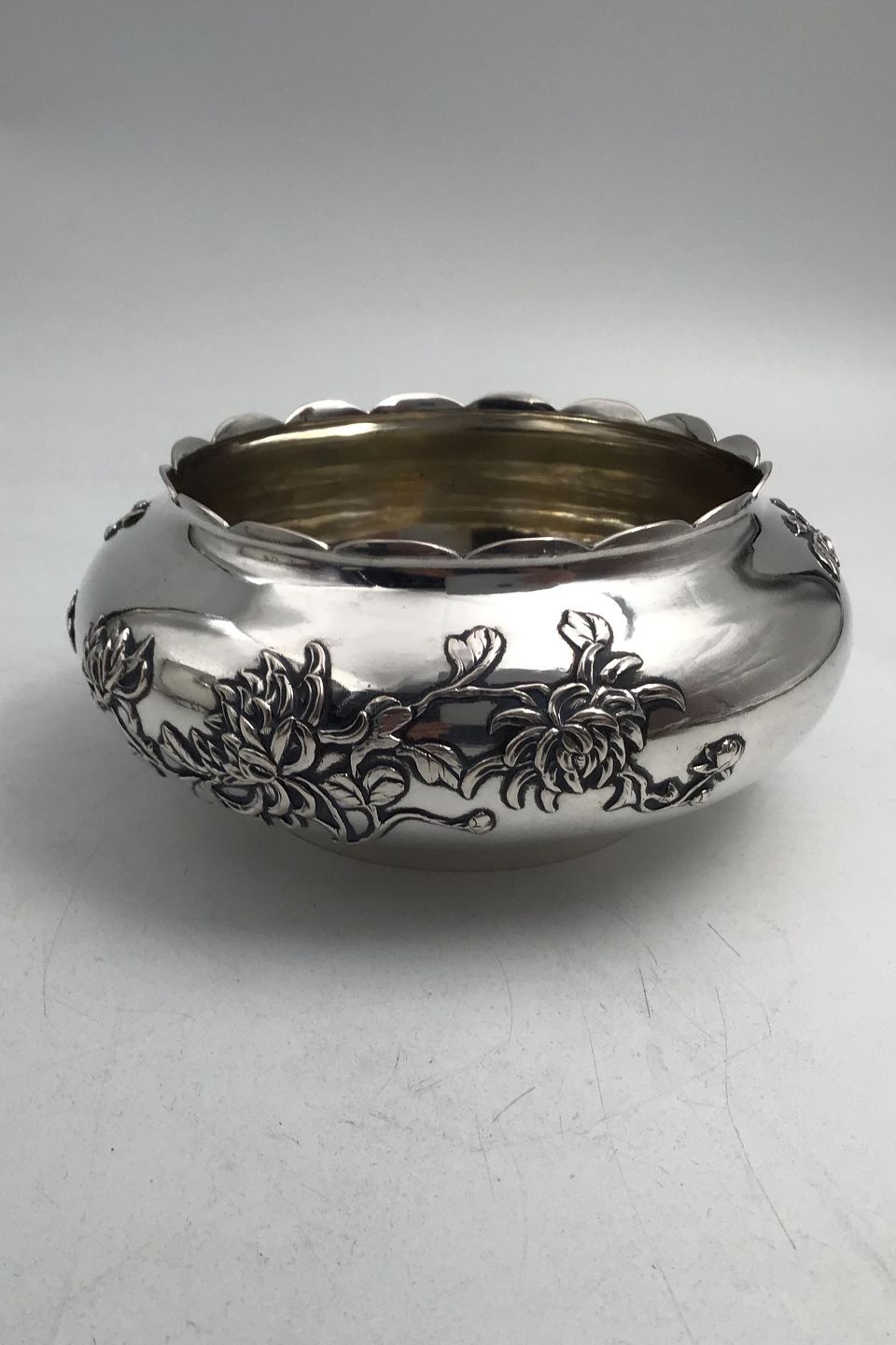 Description: Antique Chinese Sterling Silver Bowl (Luen Wo, Shanghai) Chrysantemum floral decor