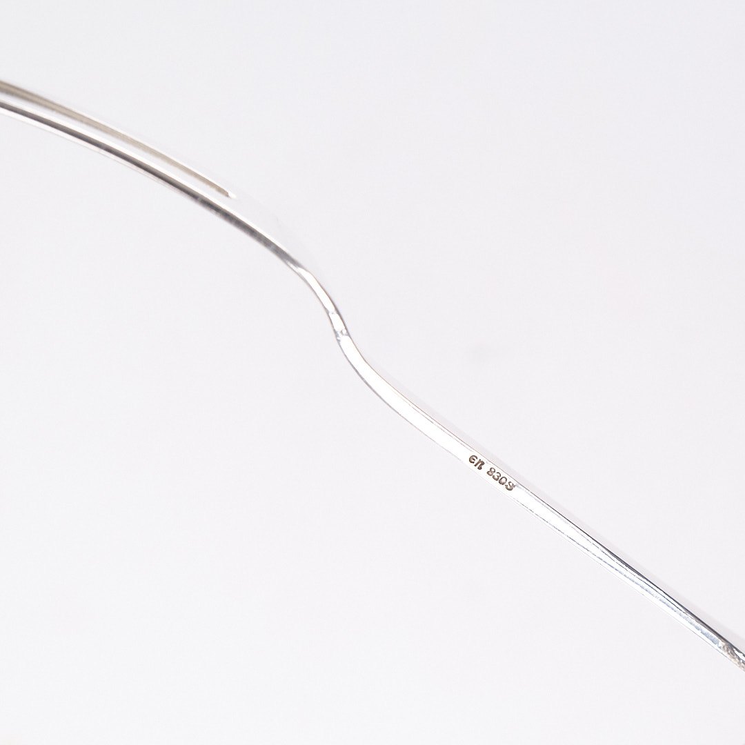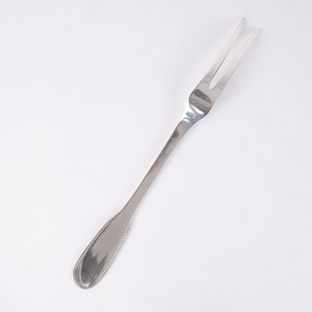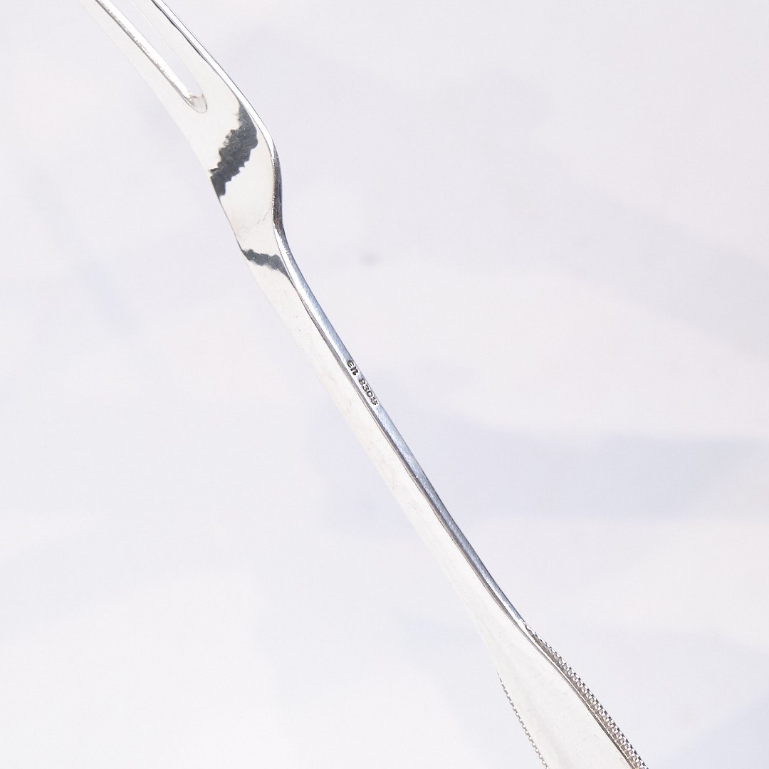 Beskrivelse: Stegegaffel i mønster nr. 14 af Evald Nielsen. Tretårnet sølv, stemplet. Dansk sølvarbejde med tidløst design.