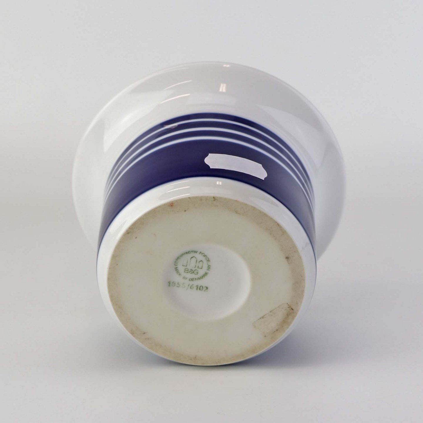 Beskrivelse: Lille urtepotteskjuler i glat hvidt porcelæn dekoreret med blå striber. Nr. 1855/6102