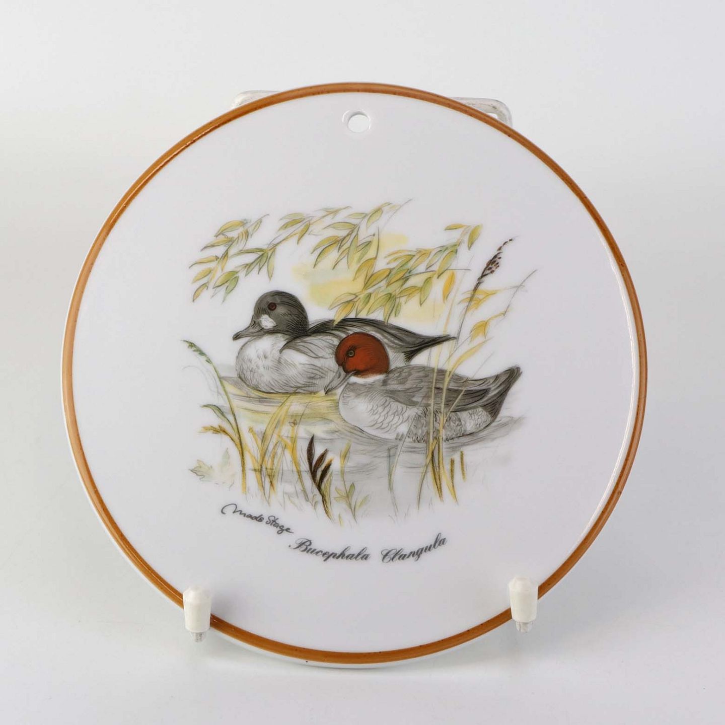 Beskrivelse: Rund smørbrik i porcelæn med forboret hul til ophæng og motiv af ænder fra stellet Jagtstel.