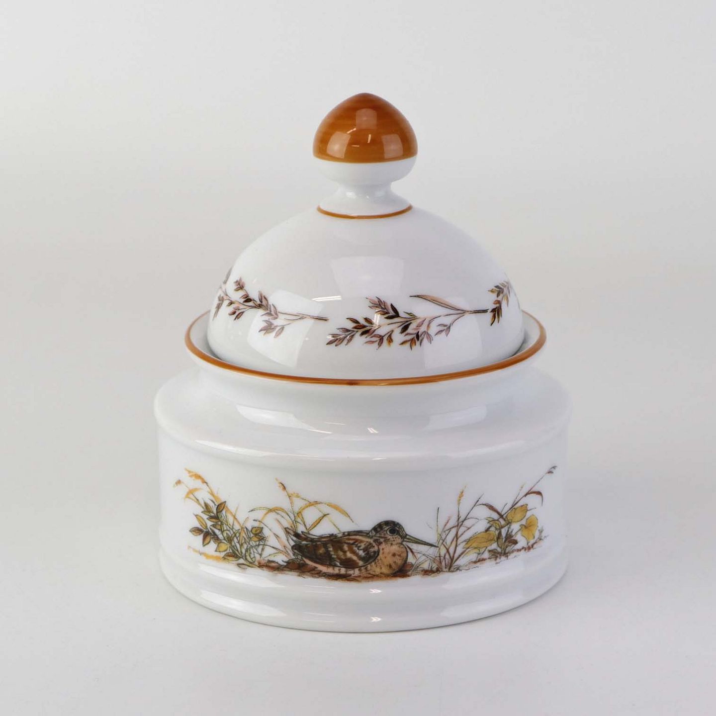 Beskrivelse: Lågkrukke til sukker i porcelæn med motiv af en sneppe fra stellet Jagtstel.