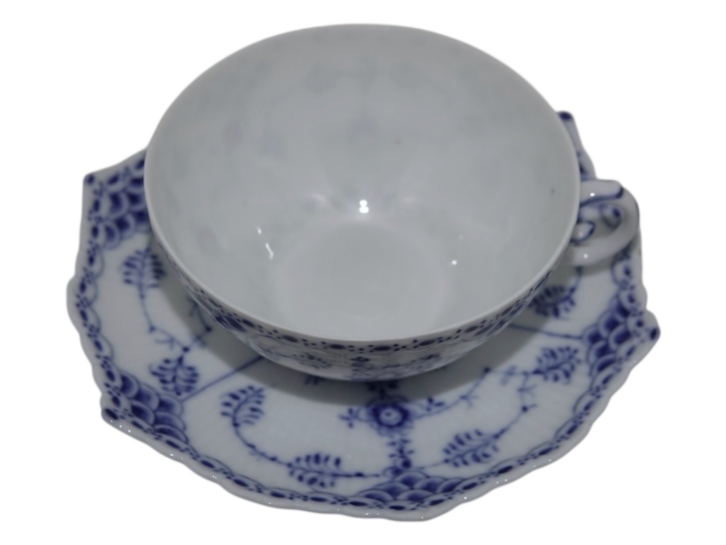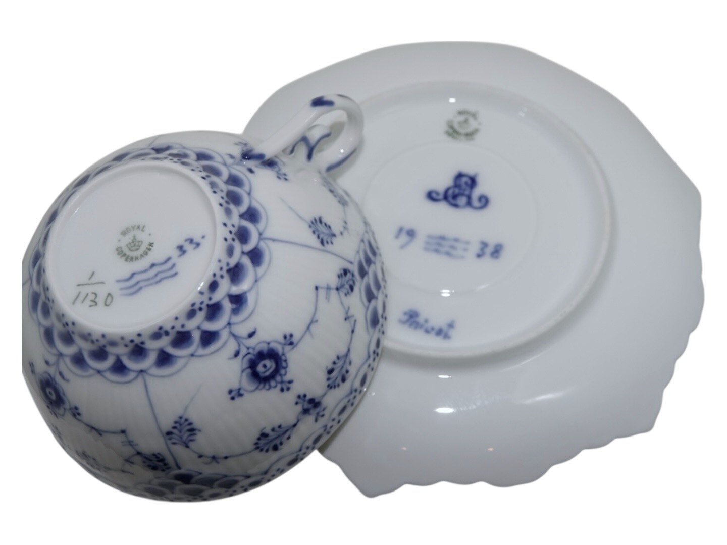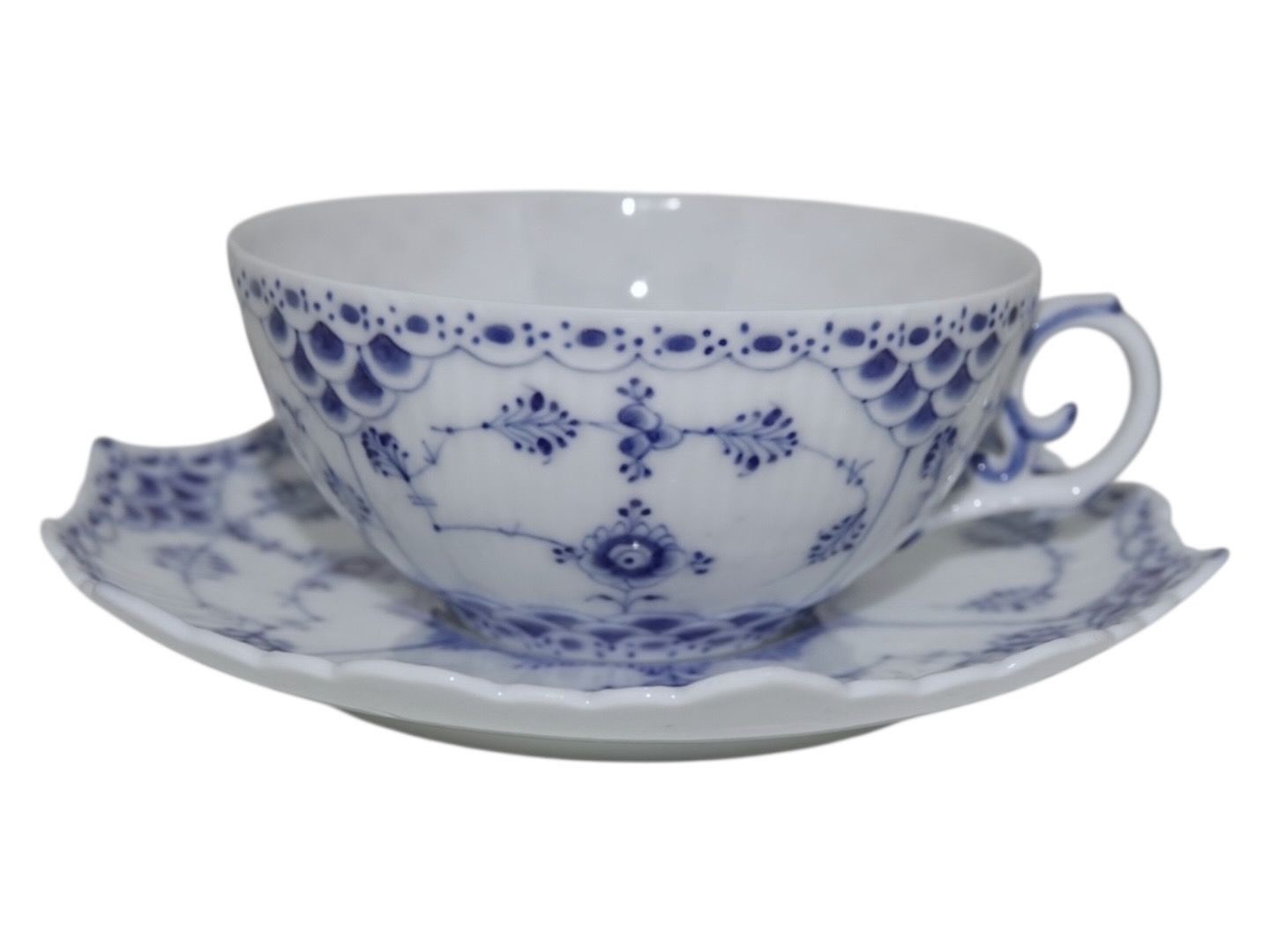 Beskrivelse: Royal Copenhagen Musselmalet Helblonde, tekop med tilhørende underkop.