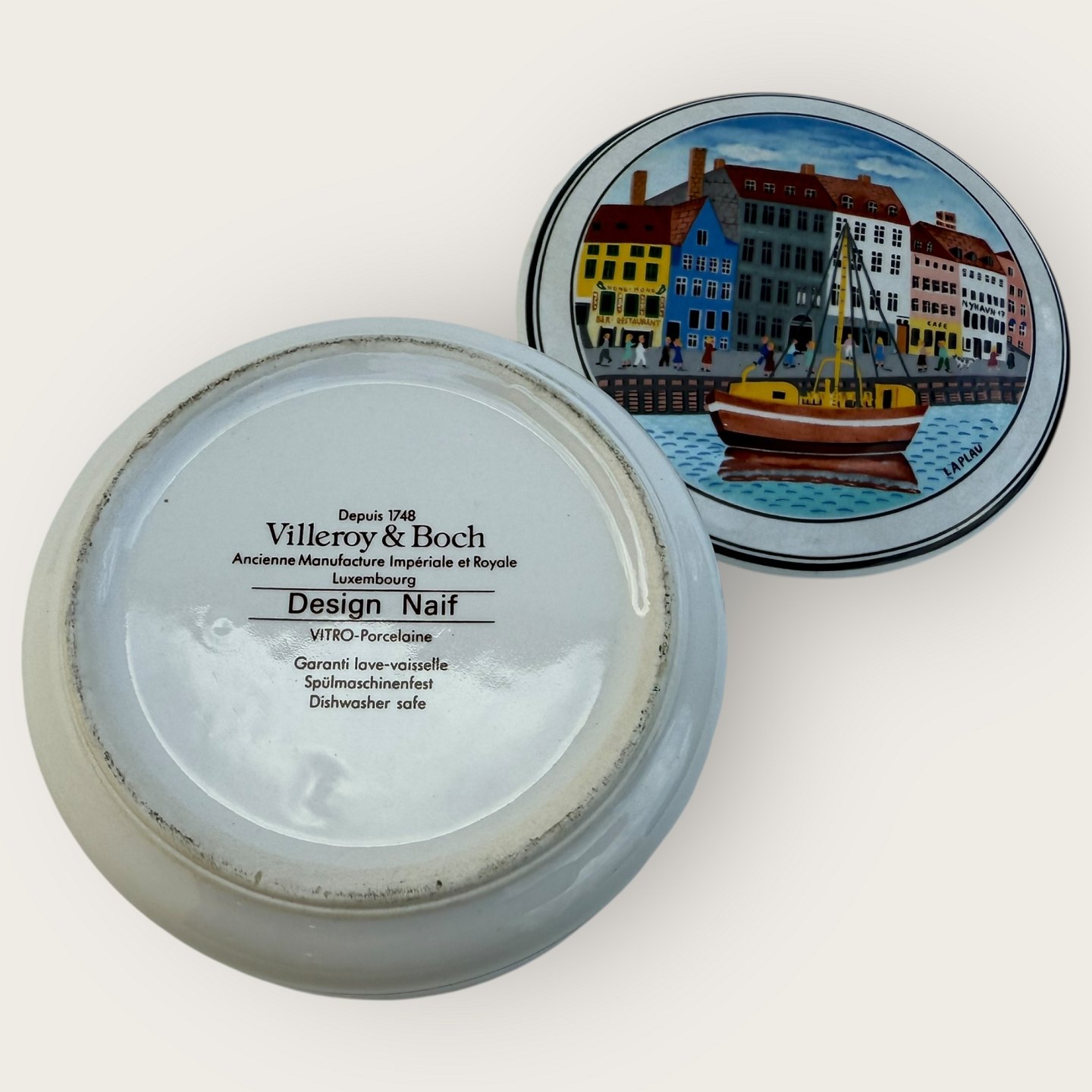 Beskrivelse: Villeroy & Boch, Design Naif, Laplau motiv fra Nyhavn, lille lågkrukke, diameter 10cm, højde 5cm *pæn stand*