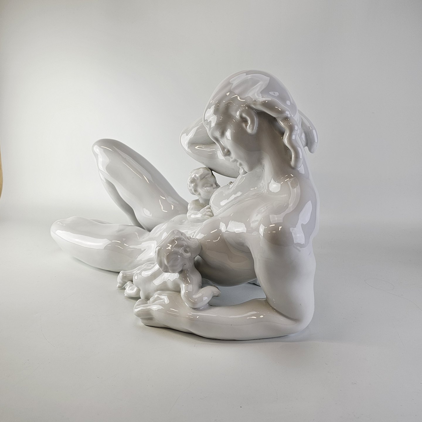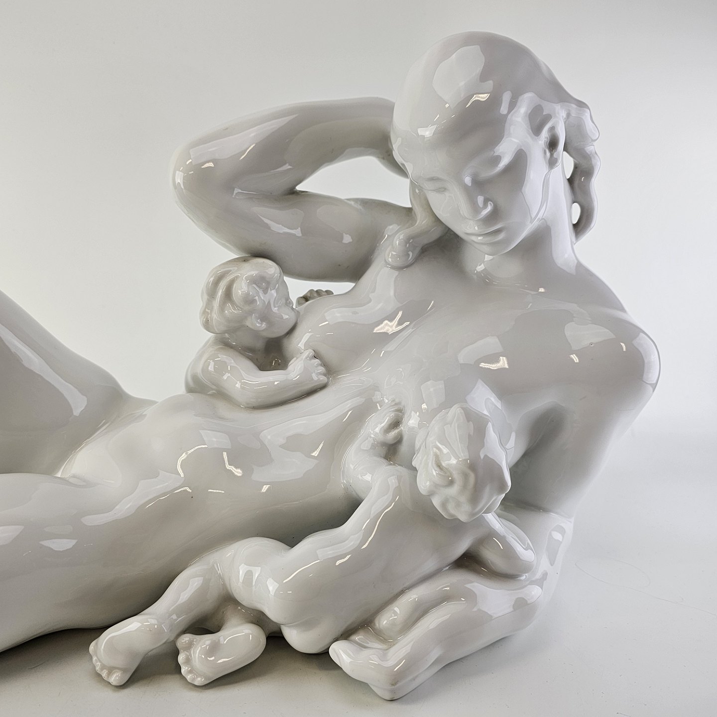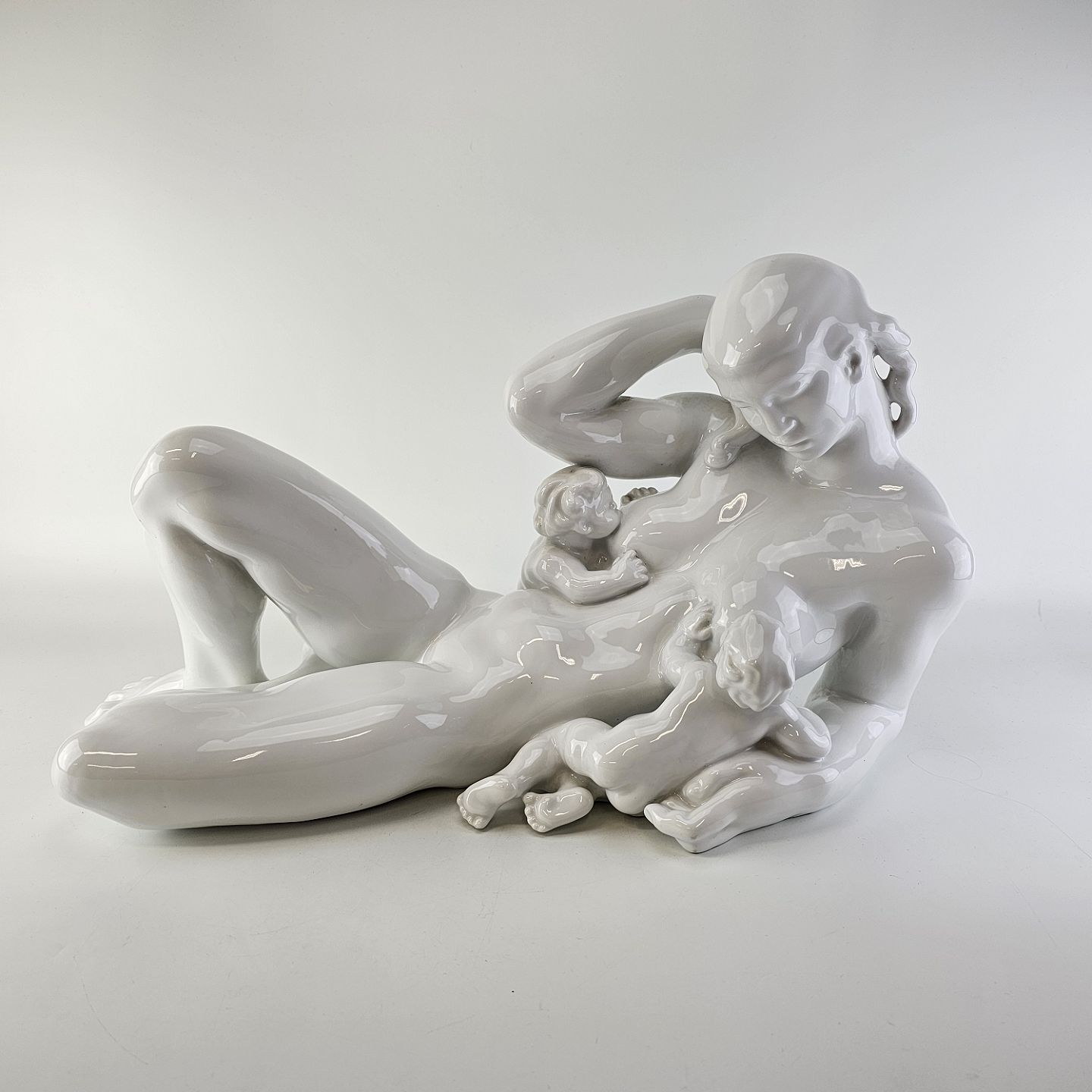 Beskrivelse: Figur i hvidt porcelæn med motiv af en kvinde som ligger med to små børn, kendt under navnene Vandmoderen og Caritas