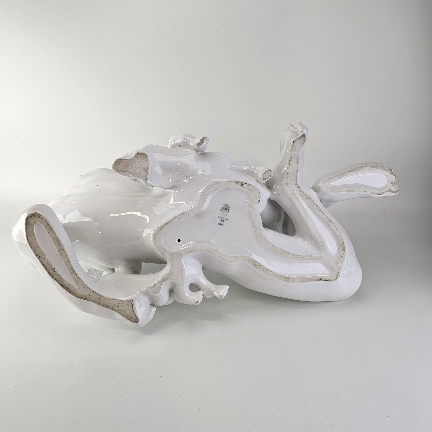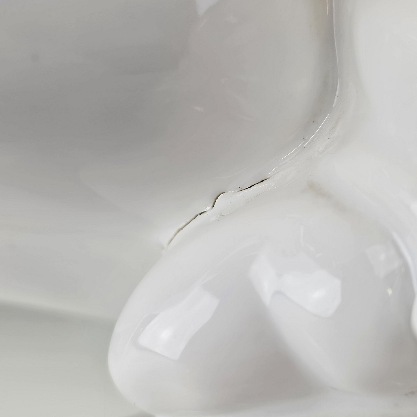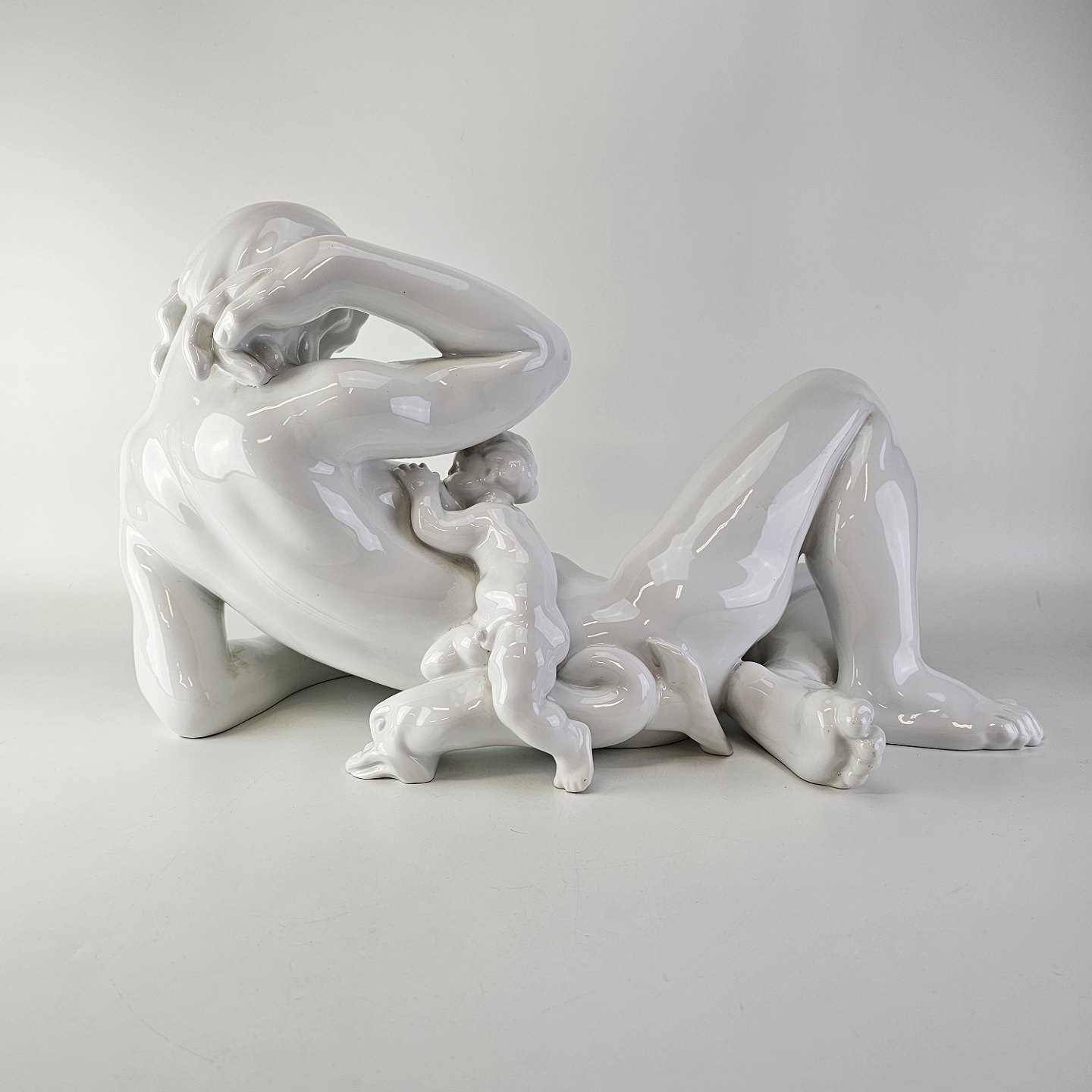 Beskrivelse: Figur i hvidt porcelæn med motiv af en kvinde som ligger med to små børn, kendt under navnene Vandmoderen og Caritas