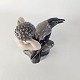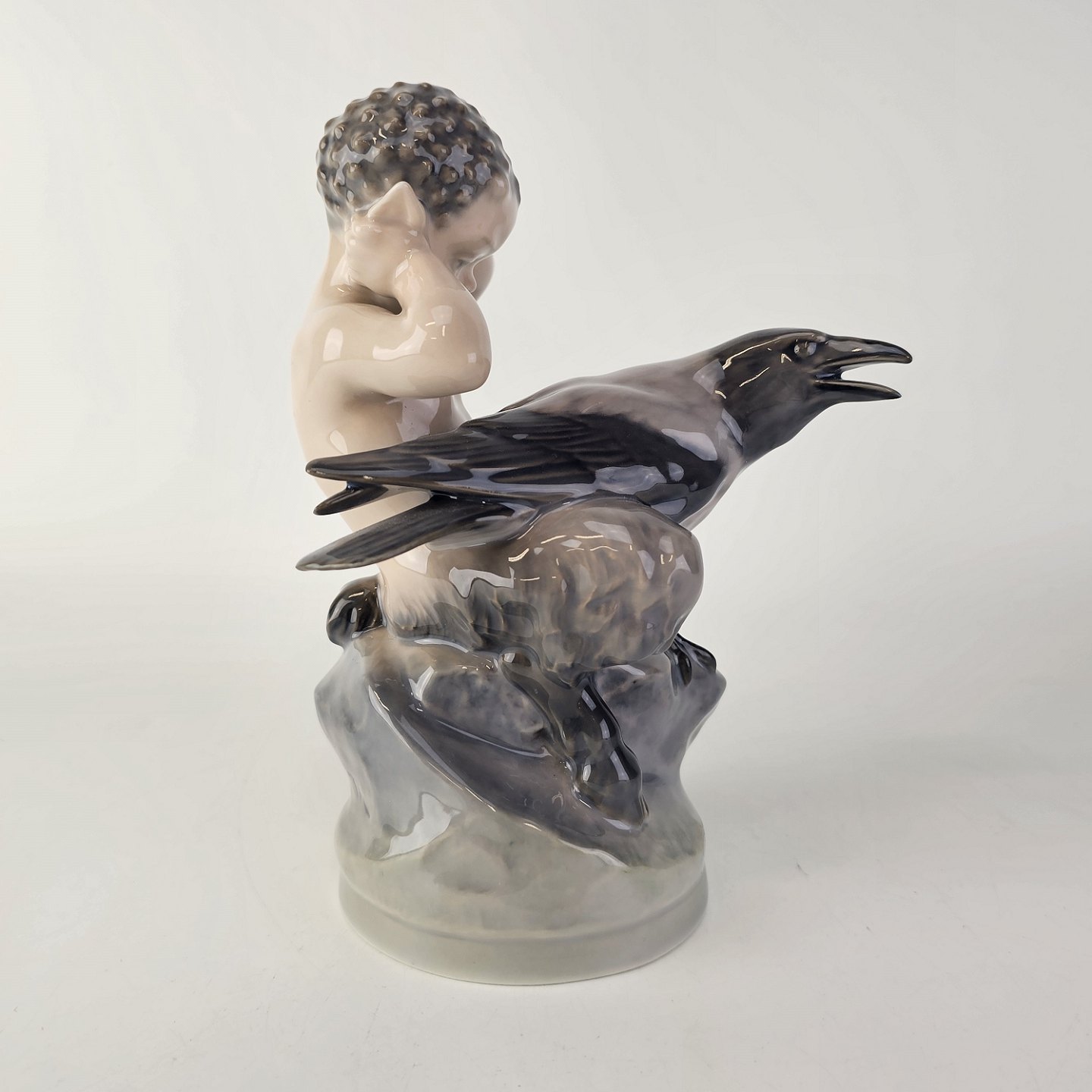 Beskrivelse: Figur af porcelæn med motiv af en faun som holder sig for ørerne med en krage i skødet
