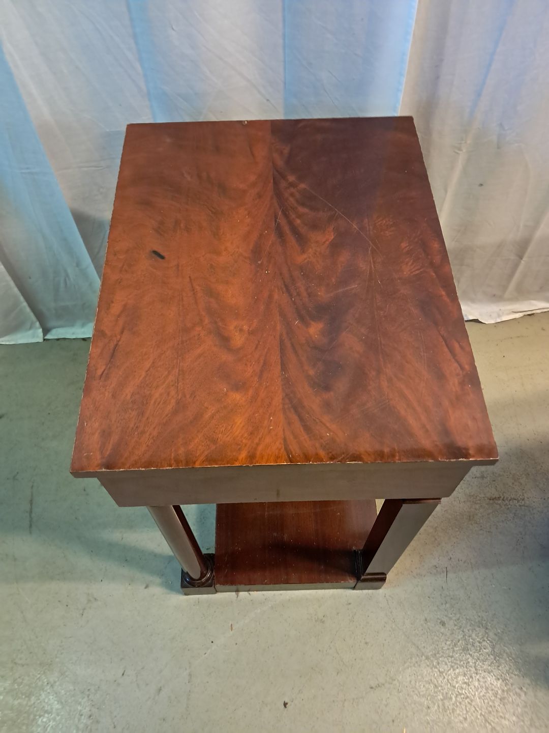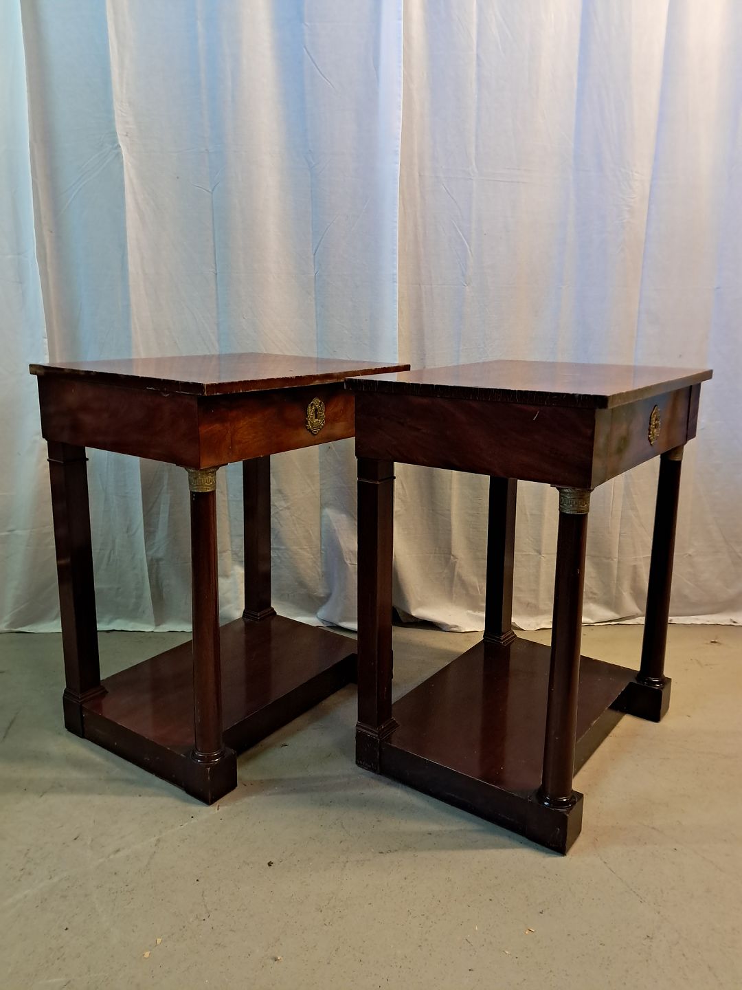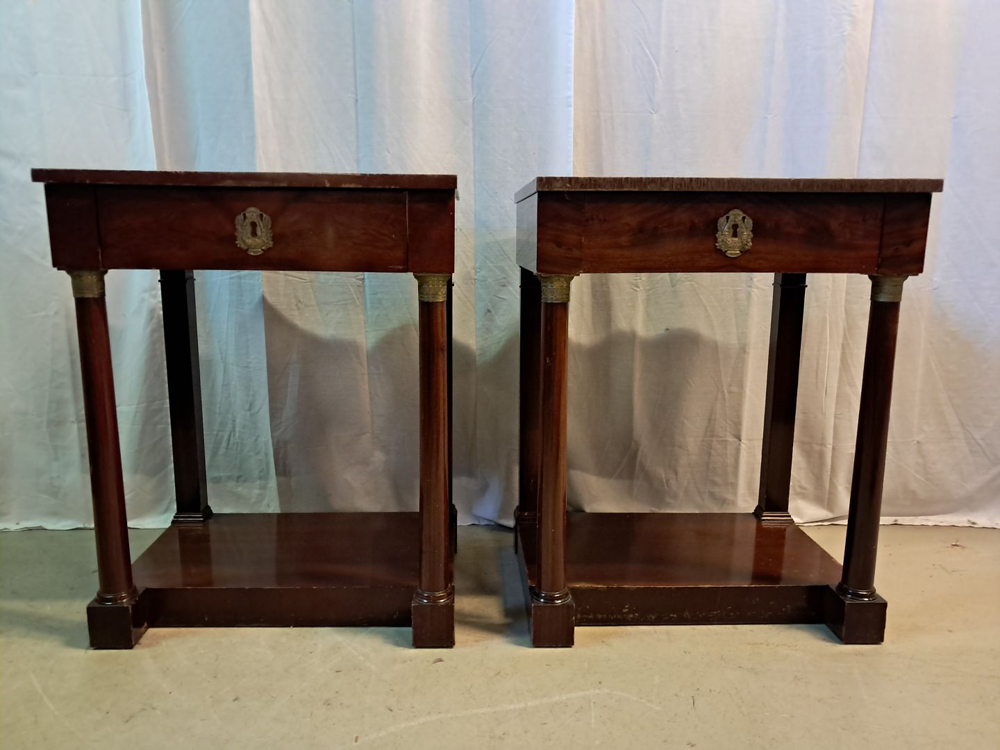 Beskrivelse: 2 Søjleborde i fineret mahogni, fra 1910erne.