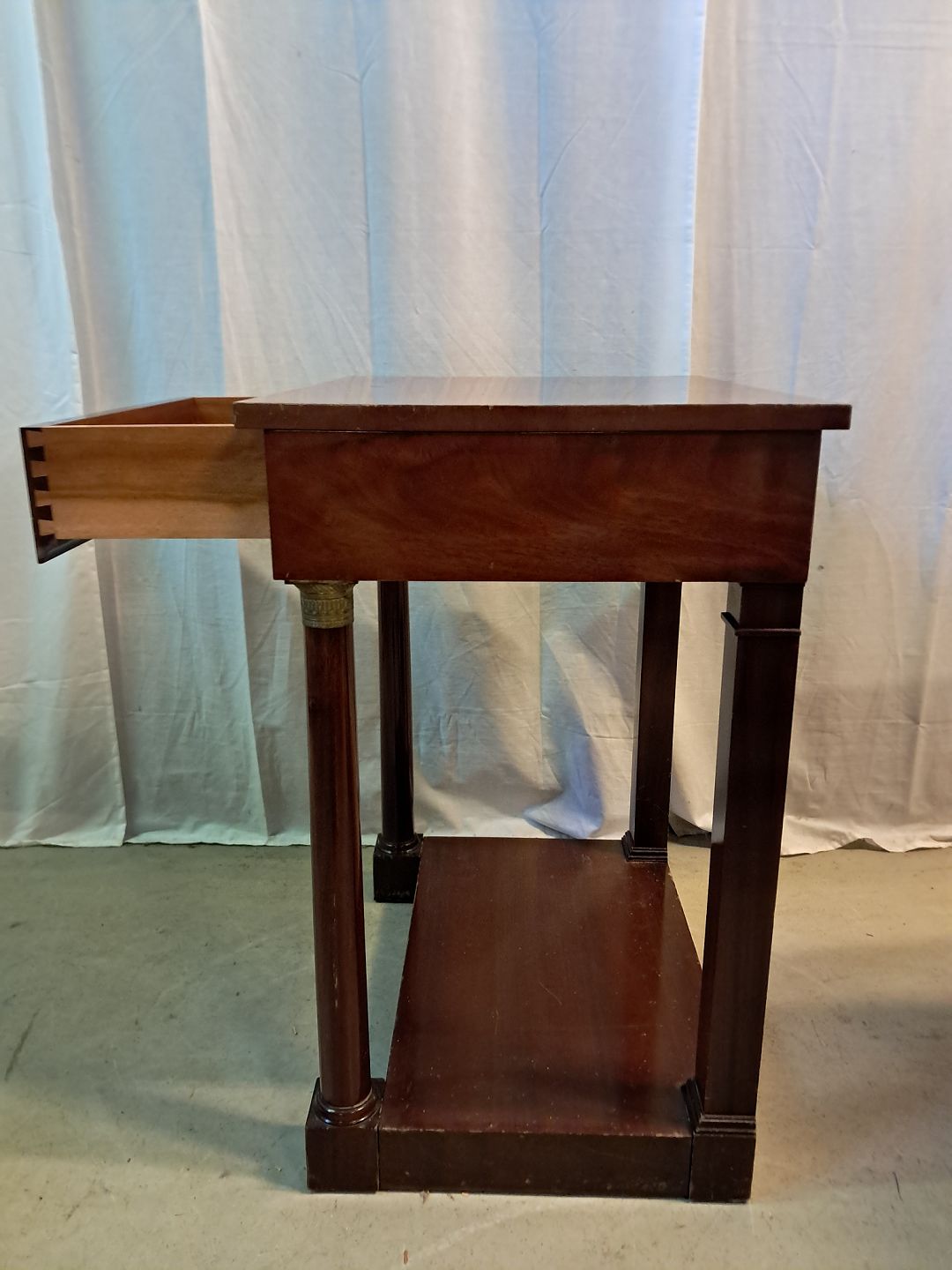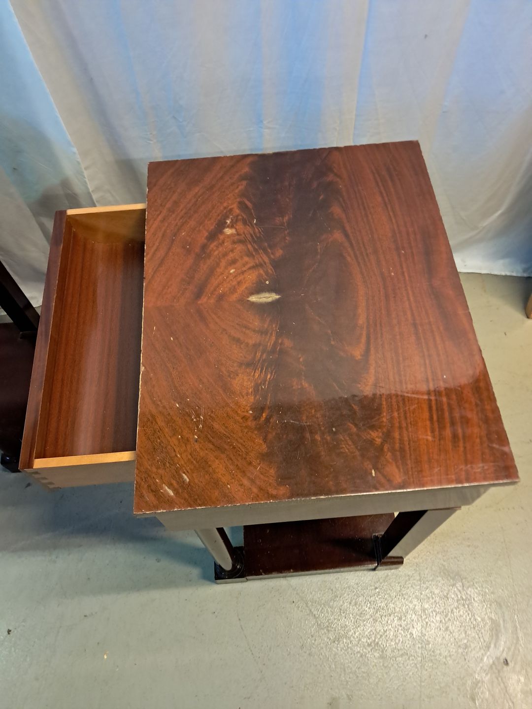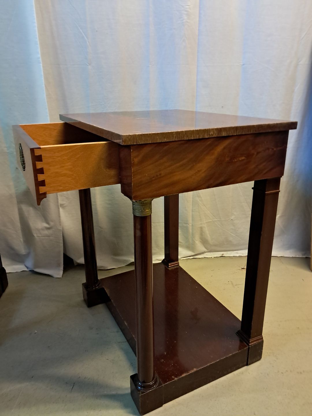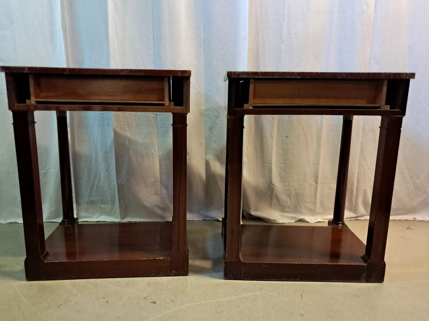 Beskrivelse: 2 Søjleborde i fineret mahogni, fra 1910erne.