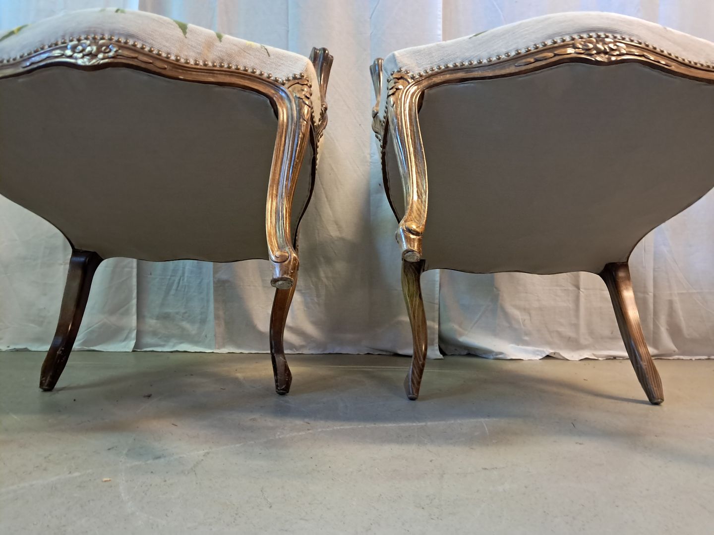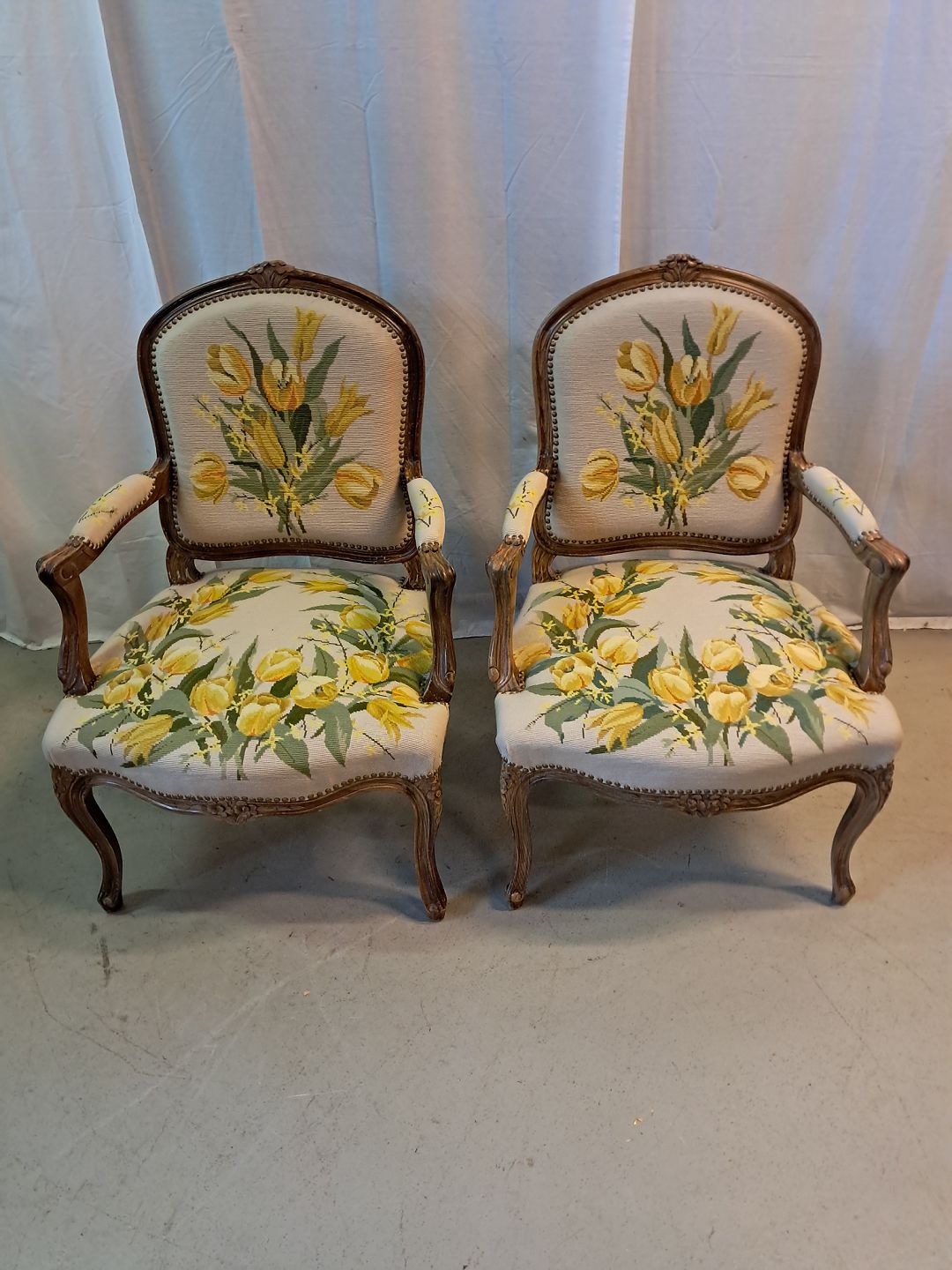 Beskrivelse: 2 Armstole i massivt bøgetræ med broderet betræk, fra 1950erne.