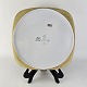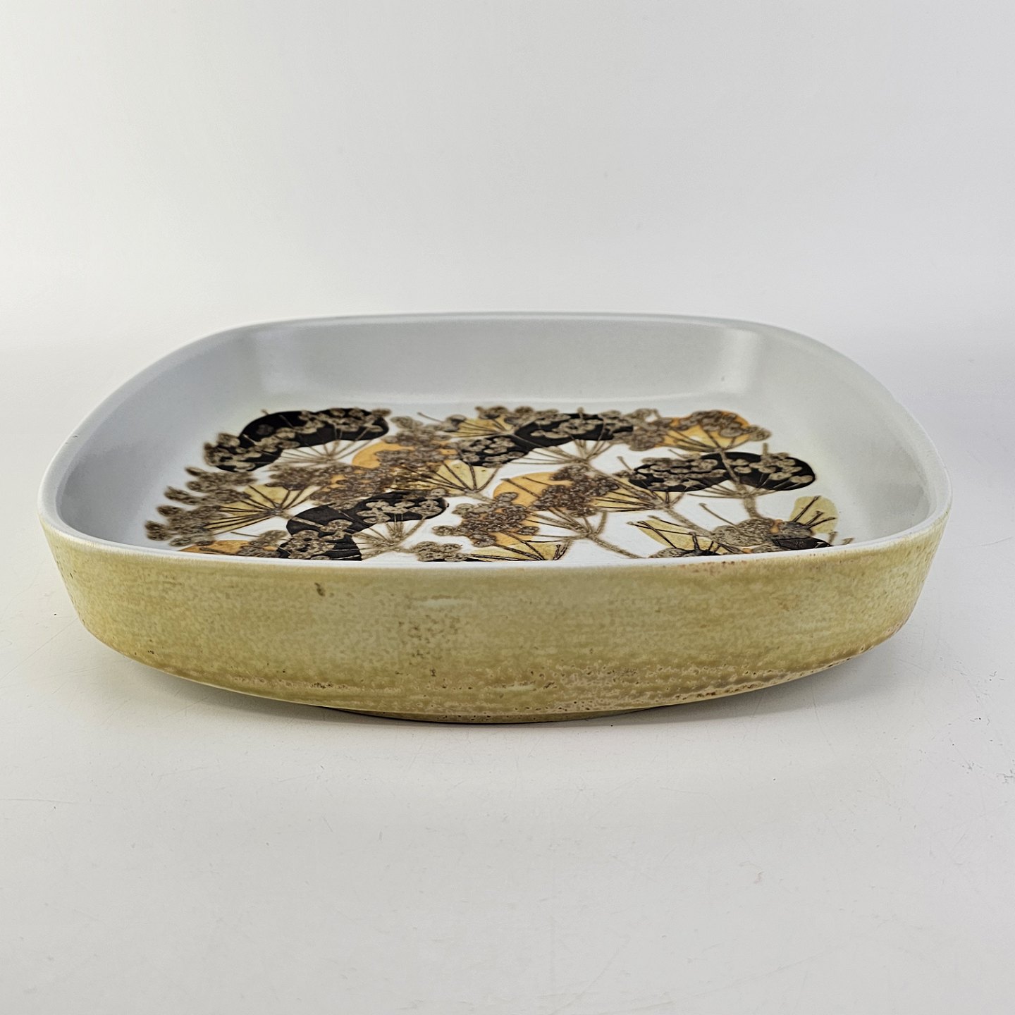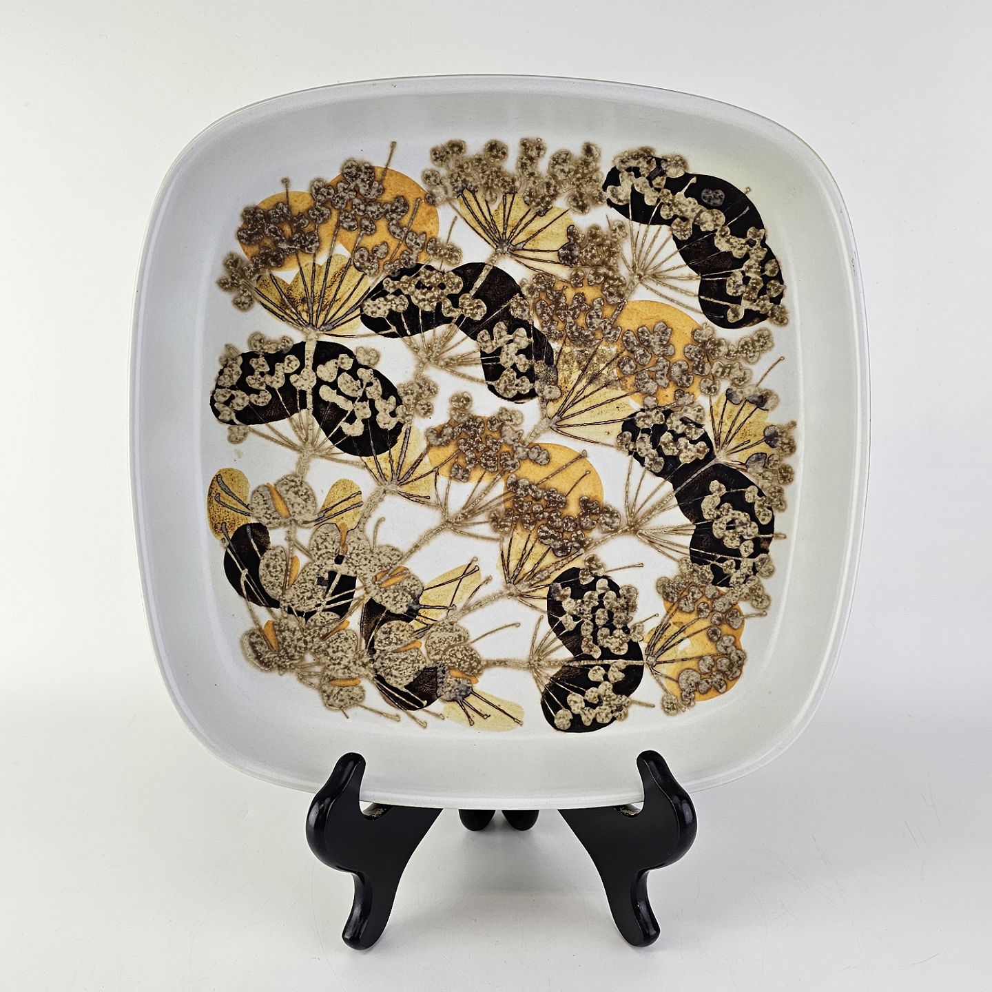 Beskrivelse: Firkantet fad i hvid fajance fra serien Baca med abstrakt blomstermotiv i brune, sorte og gyldne nuancer