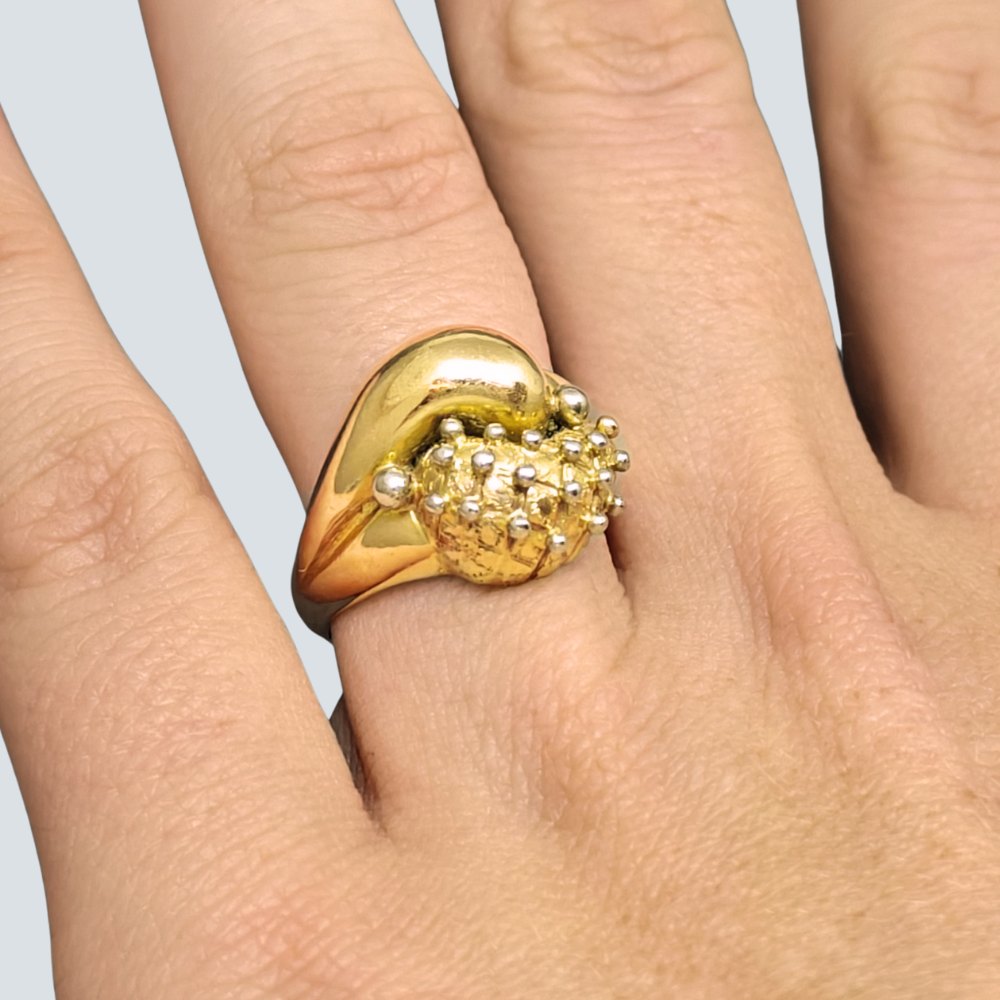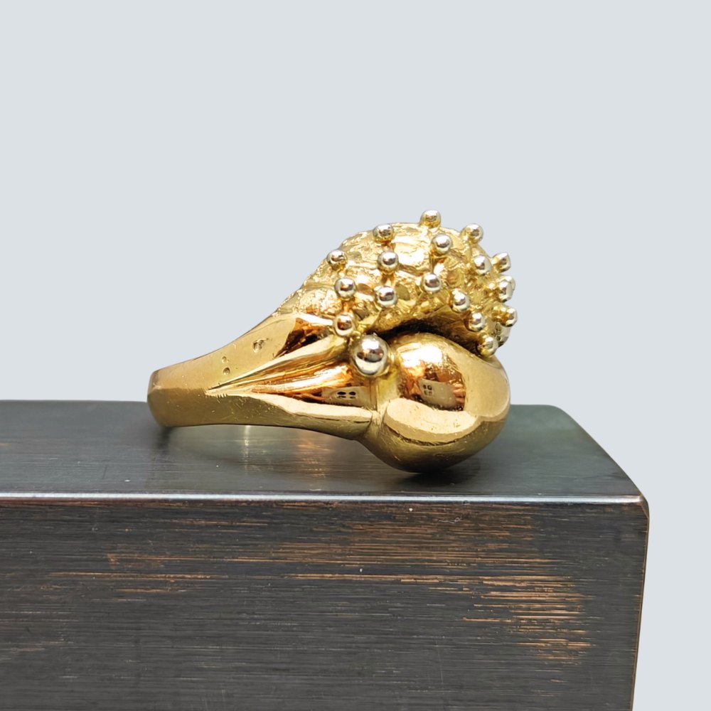 Beskrivelse: Ring i 18 kt. guld prydet med mønster foran. Ring str. 55.
