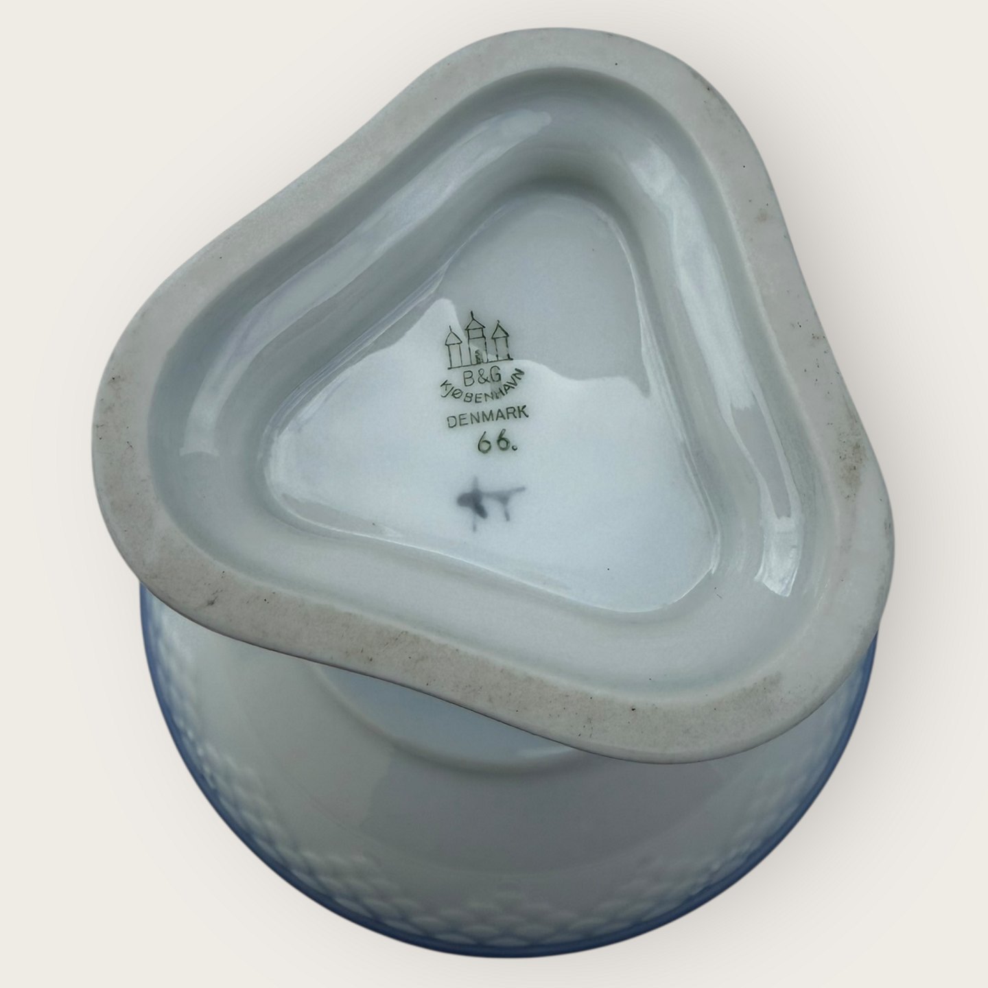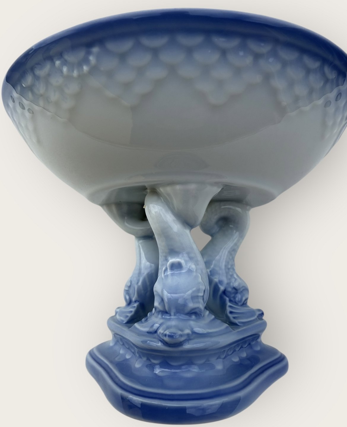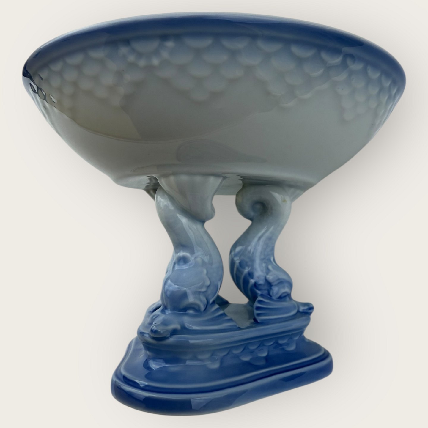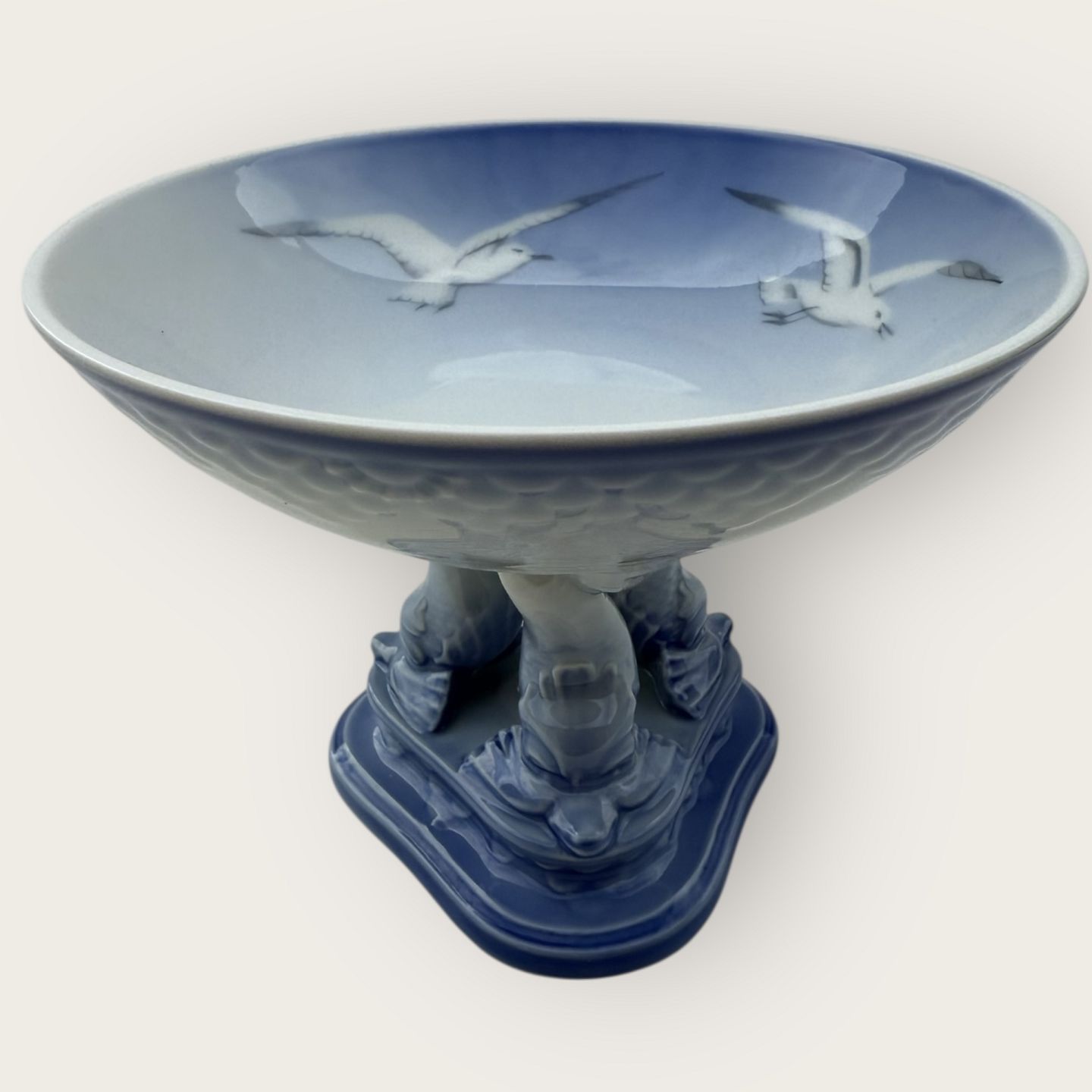 Beskrivelse: Bing & Grøndahl, Måge uden guld, Opsats med delfiner, 14cm i diameter, 10cm høj, 2.sortering, Design Fanny Garde *Pæn stand*