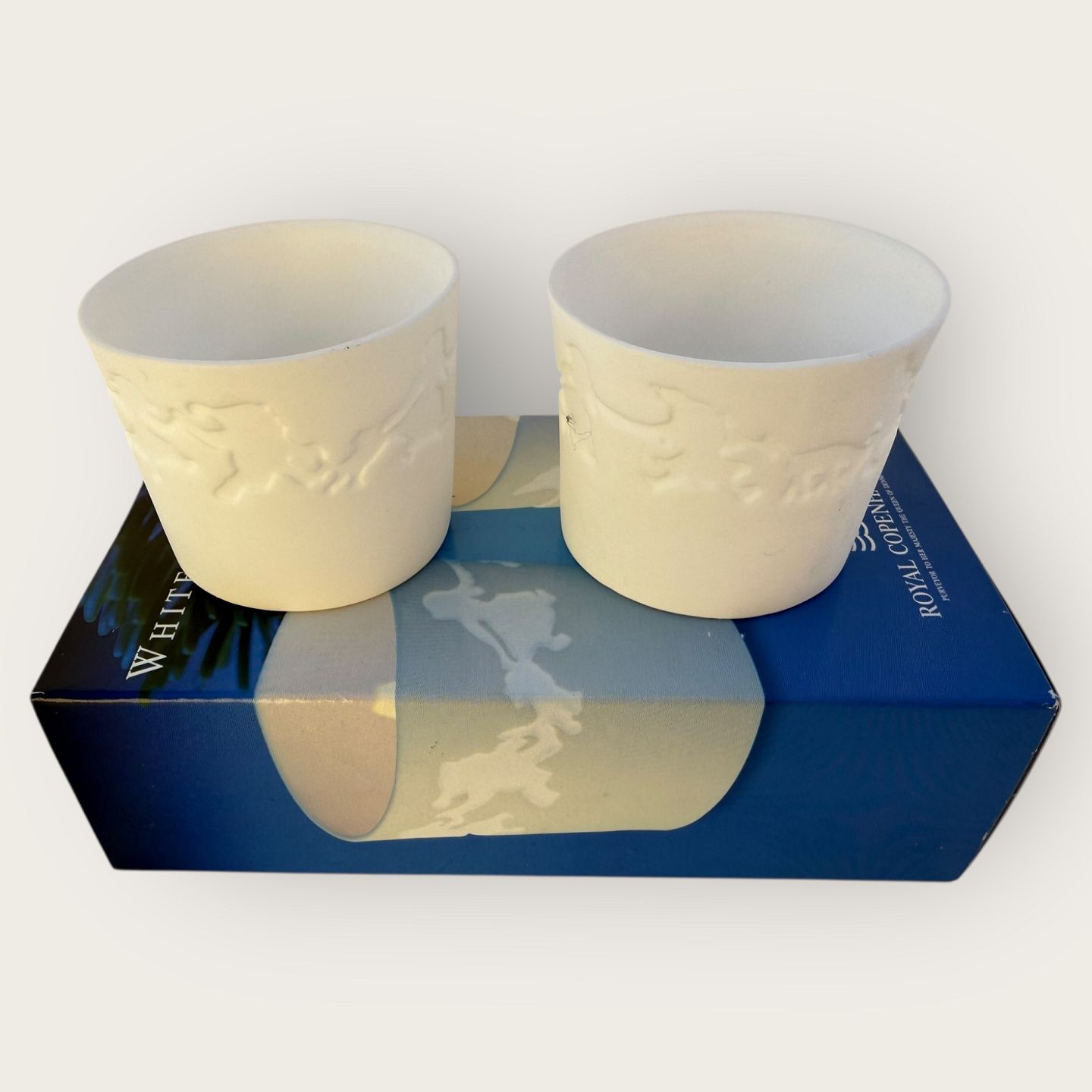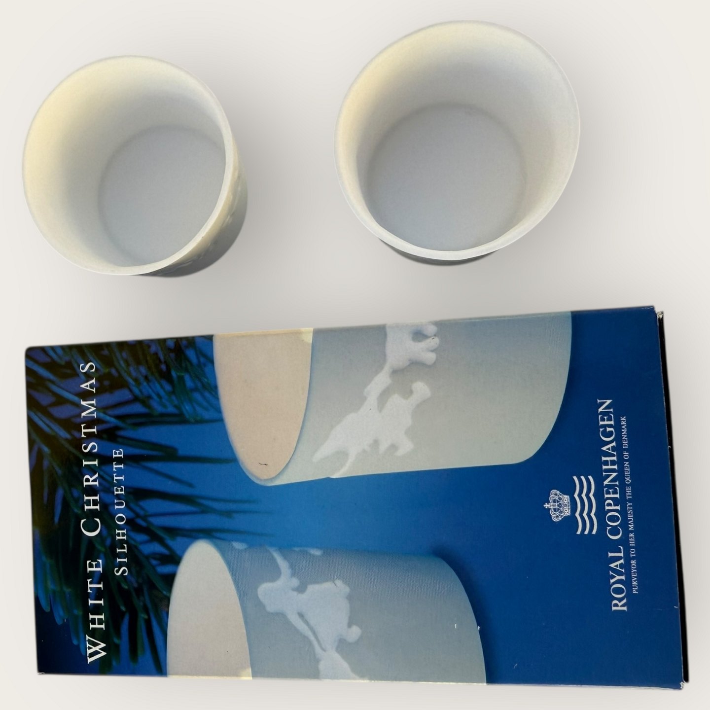 Beskrivelse: Royal Copenhagen, Silhouette, fyrfadslyssestager med dansende nisser, 2 stk i originalæske.
