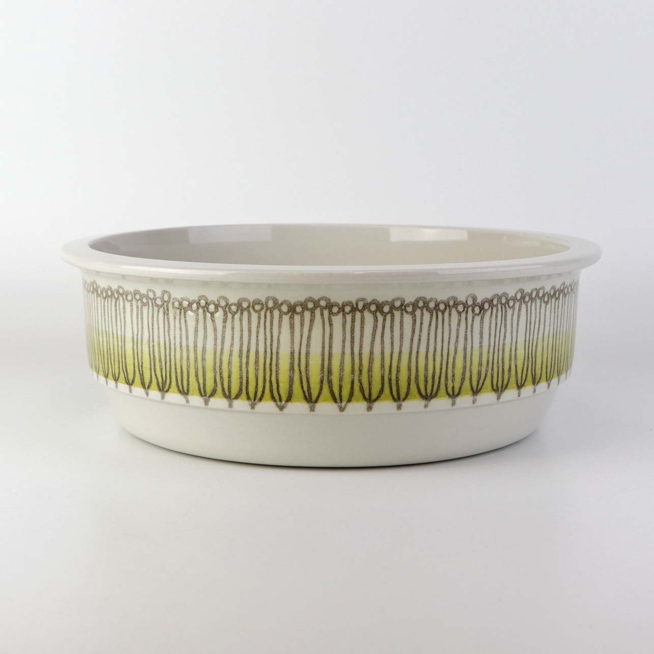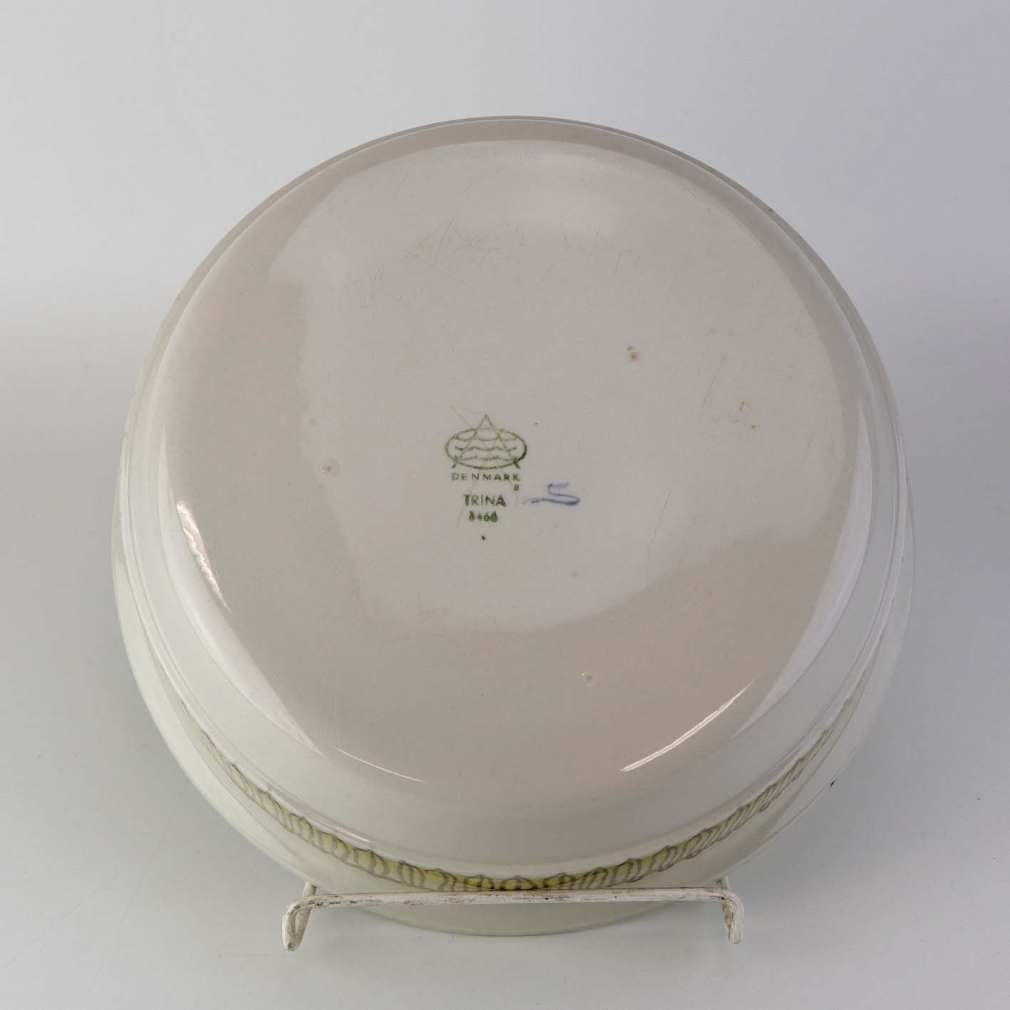 Beskrivelse: Kartoffelskål i kongelig fajance fra stellet Grøn Trina. Nr. 3466
